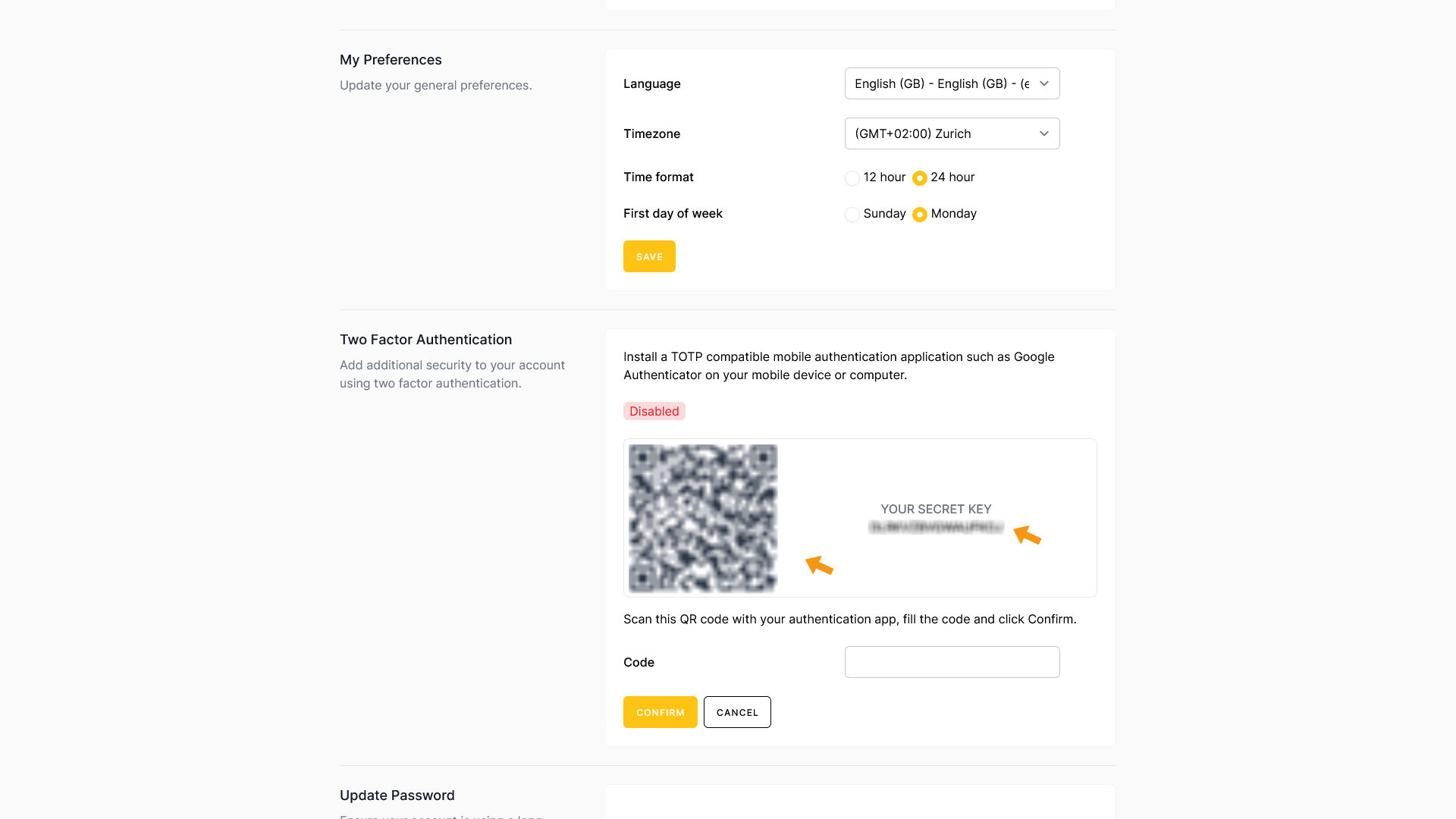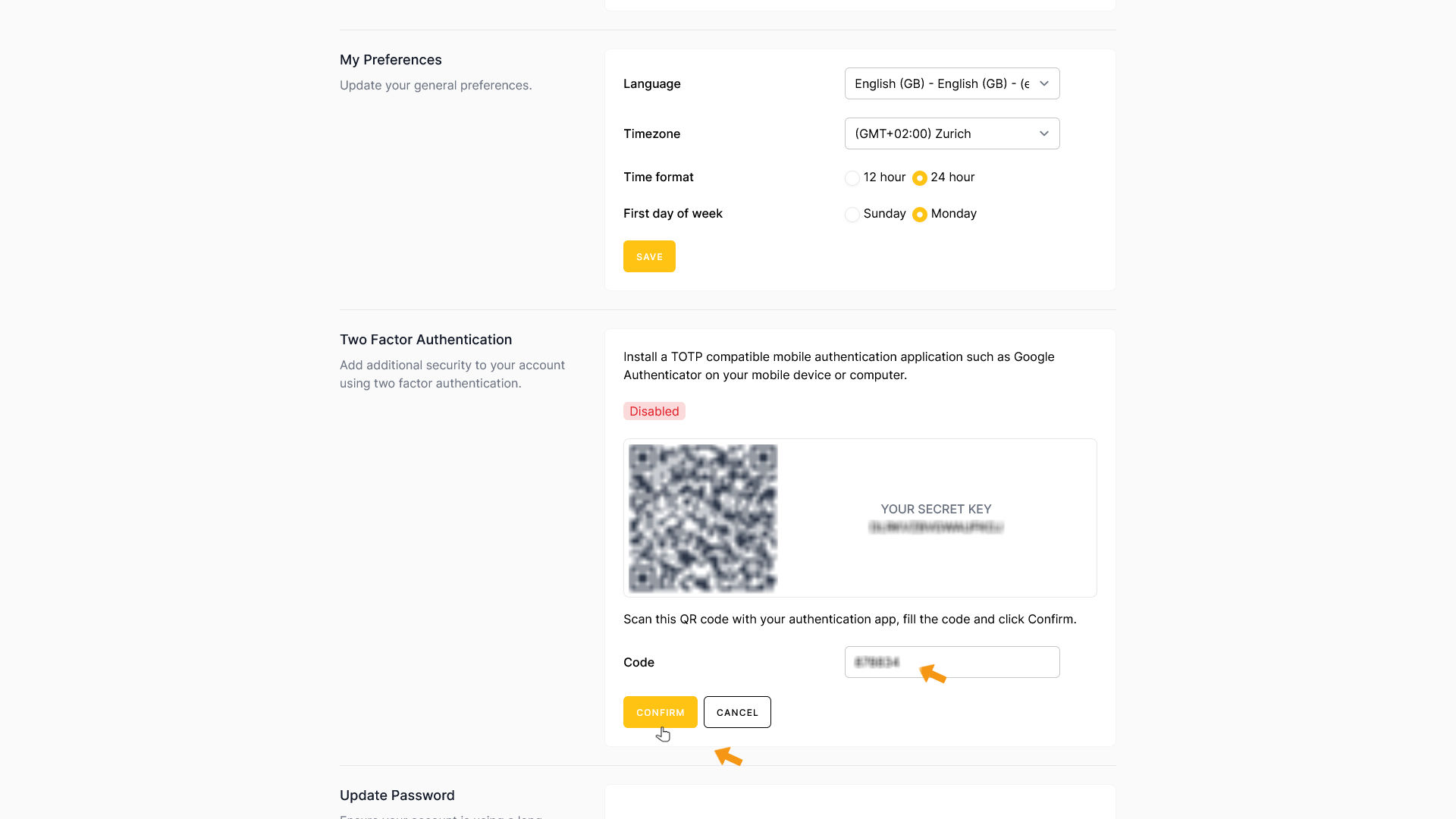 Once that’s done, your authenticator app will display a code. Enter the code into the Code field in zappzy and click CONFIRM.