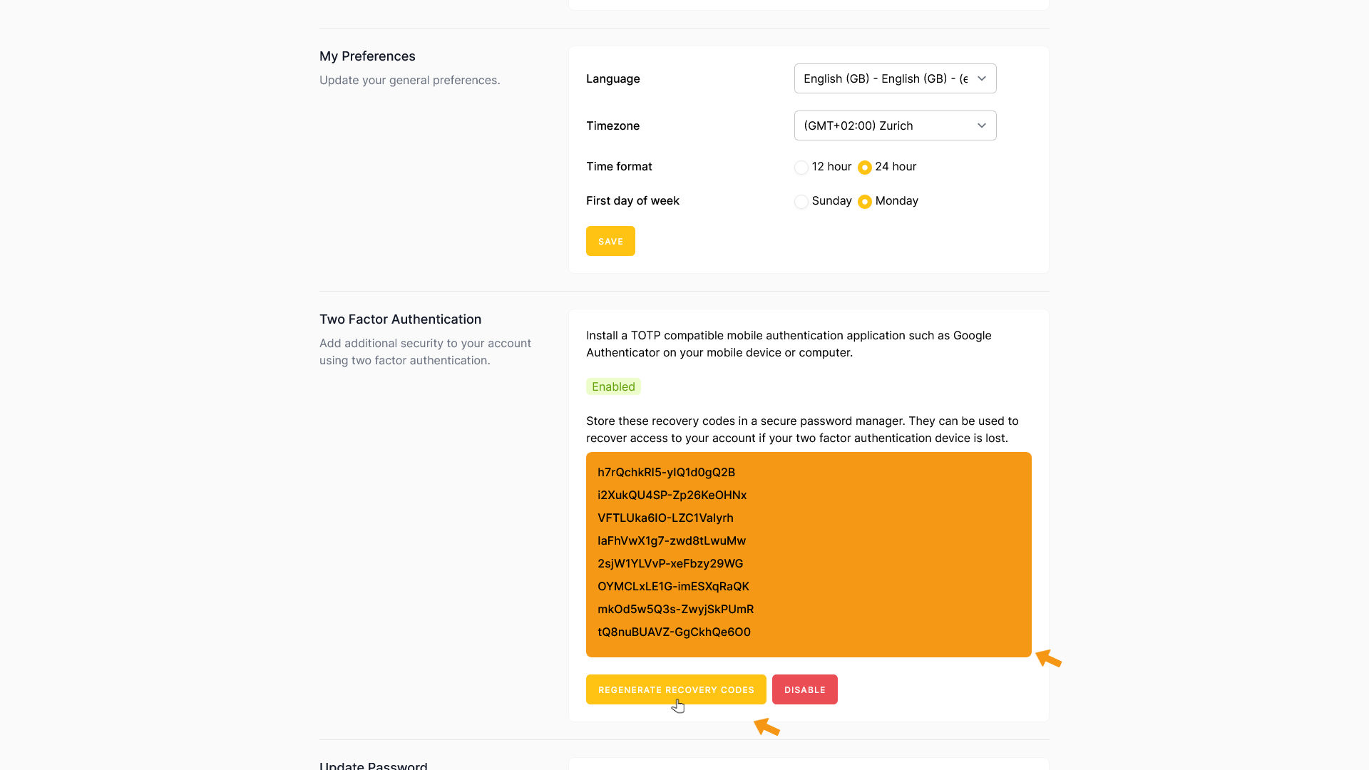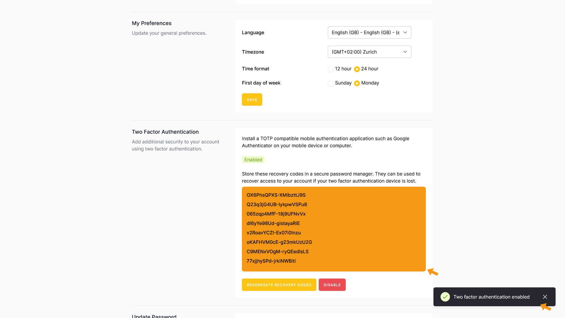 Click REGENERATE RECOVERY CODES — zappzy will create 8 new codes for you. Make sure to store them somewhere safe.