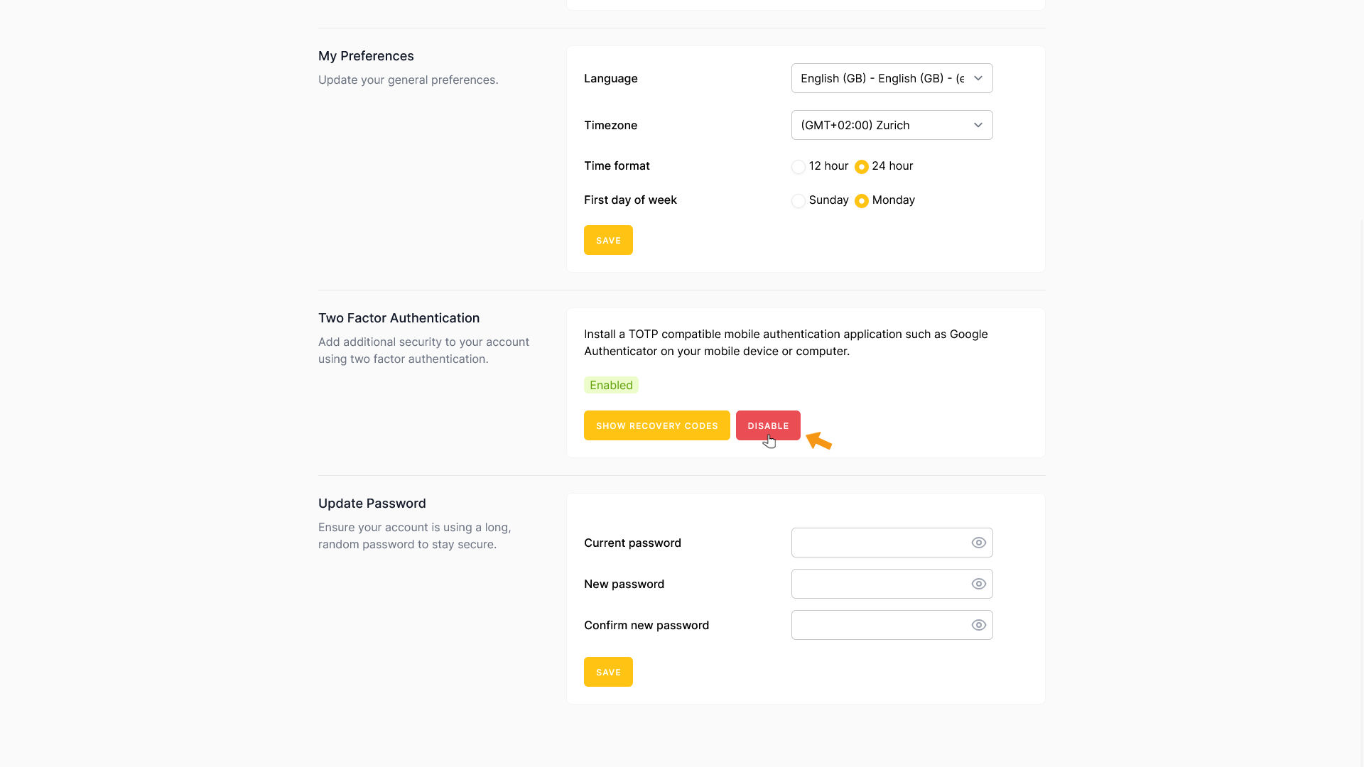 To disable two-factor authentication, click DISABLE.