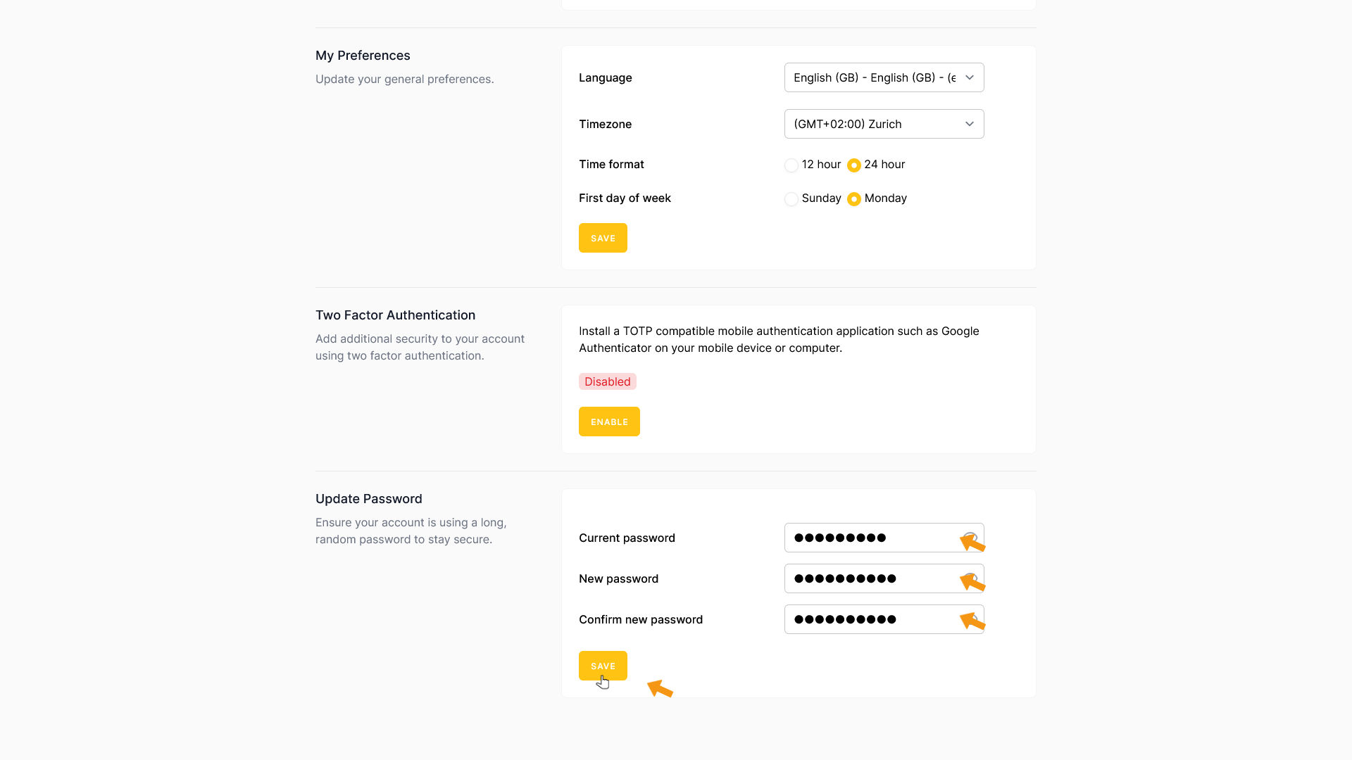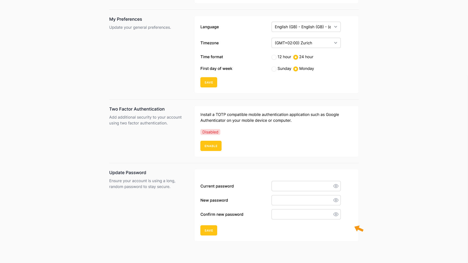 To change your current password, first enter it in the Current password field. Then enter your new password twice — once in New password and once in Confirm new password.