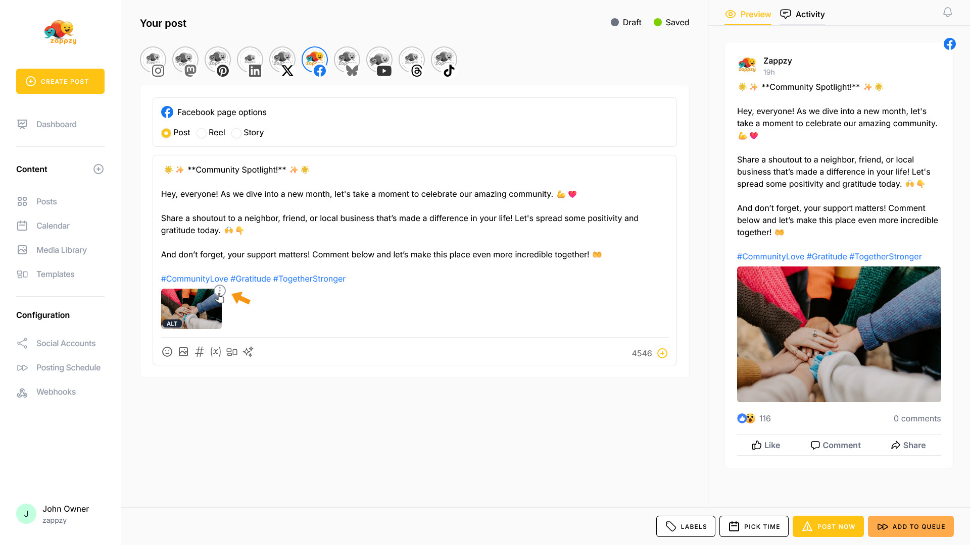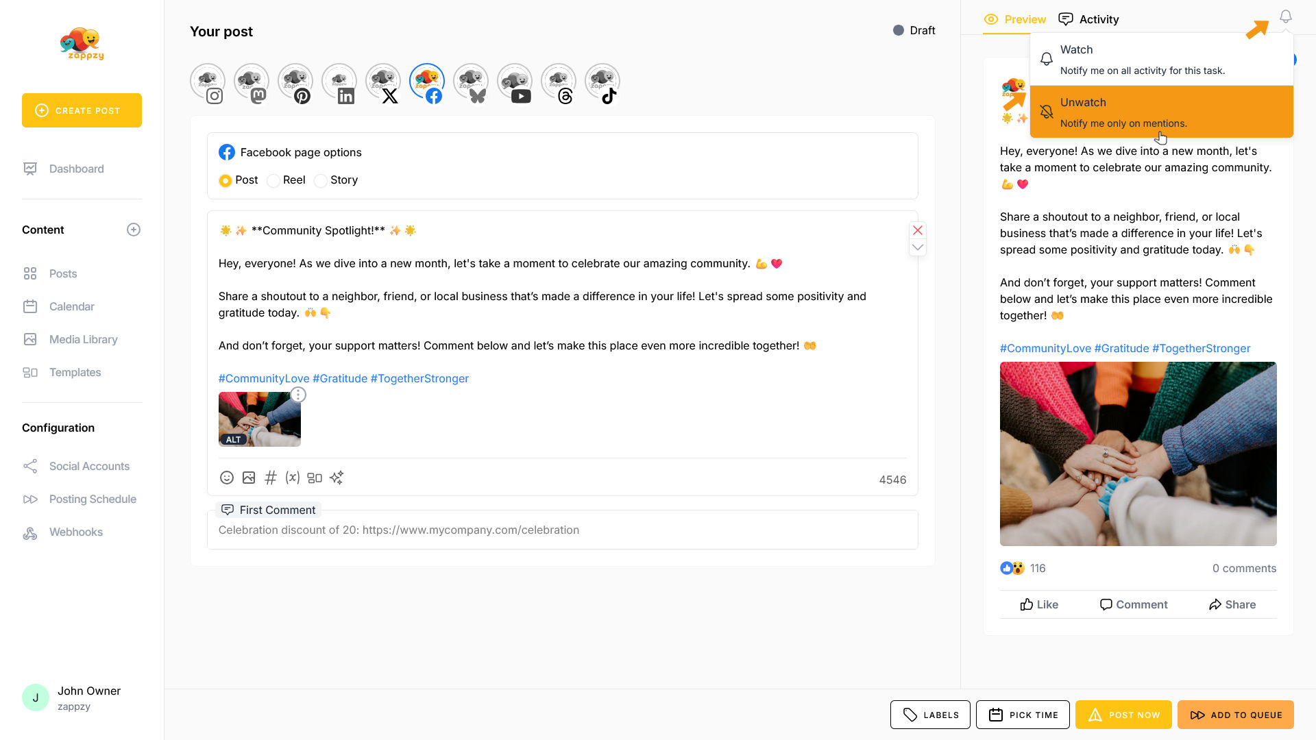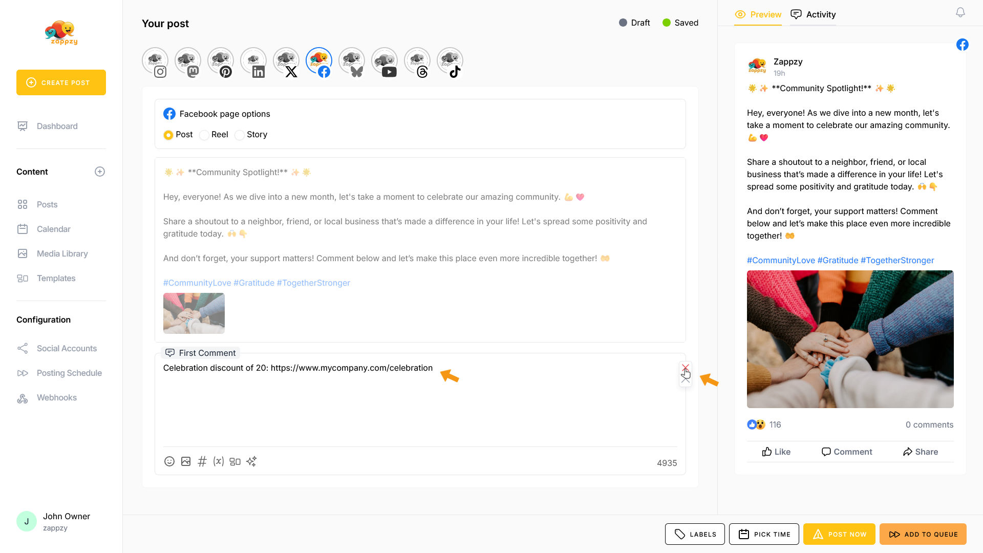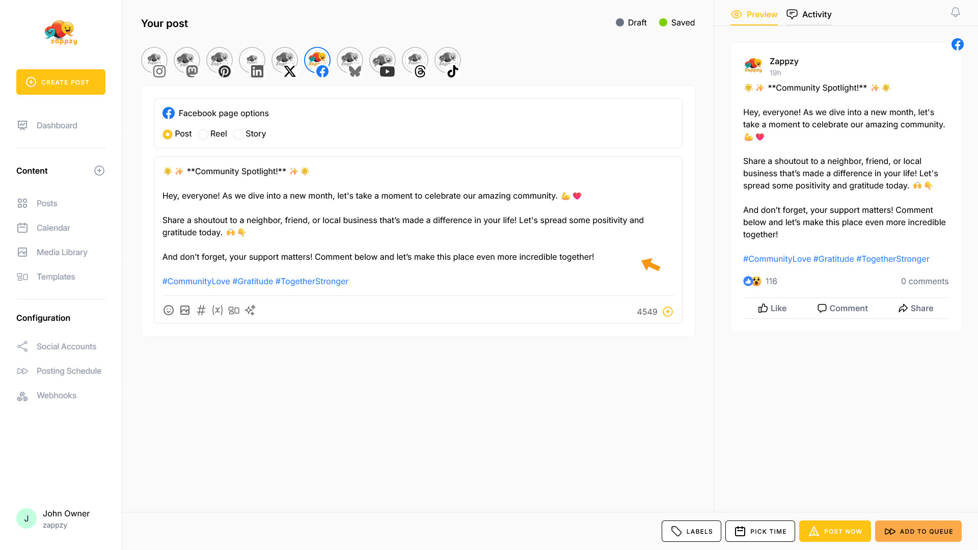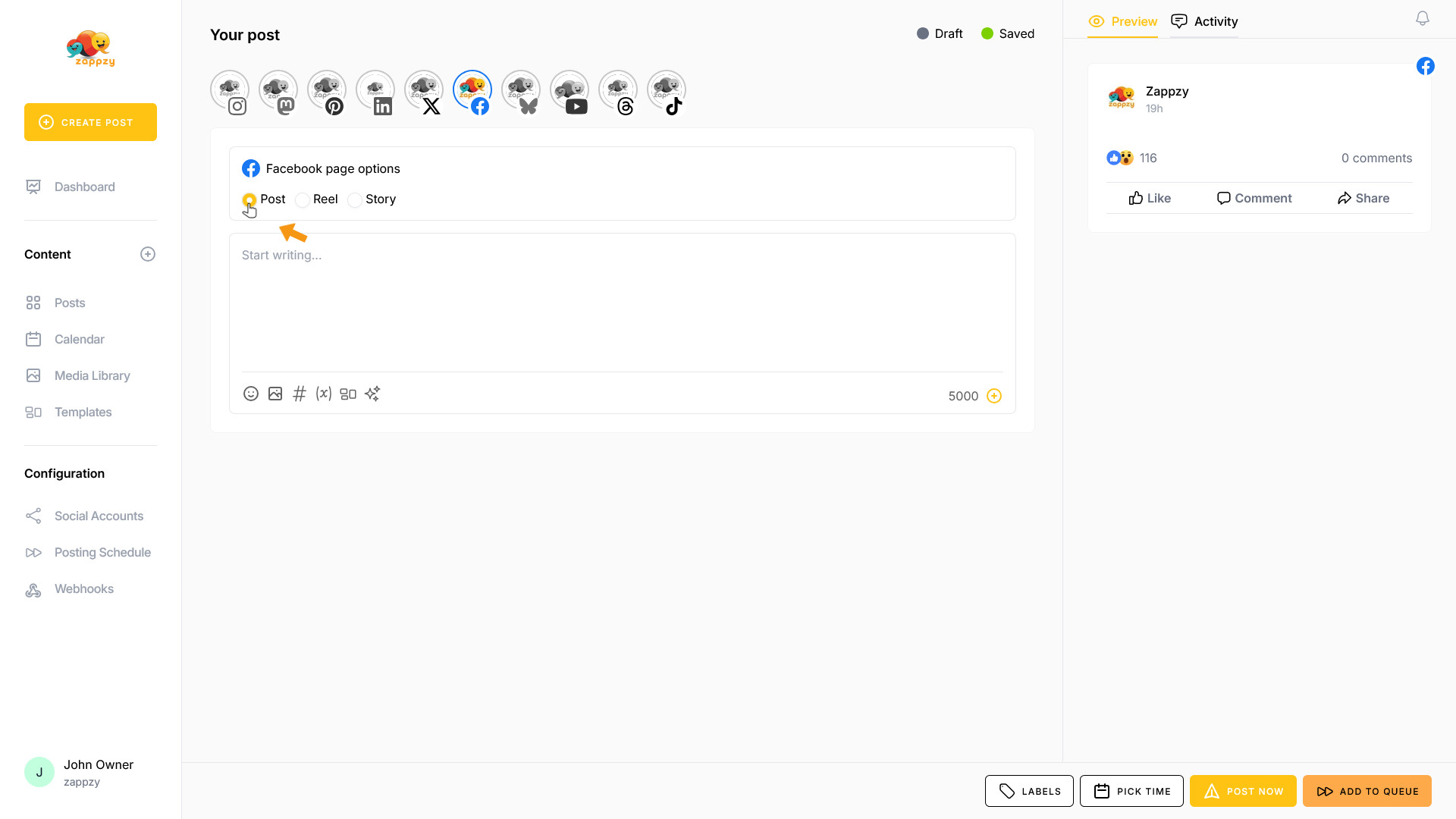 zappzy Support Center > Content > Create posts > Create a post > Create a post on Facebook
