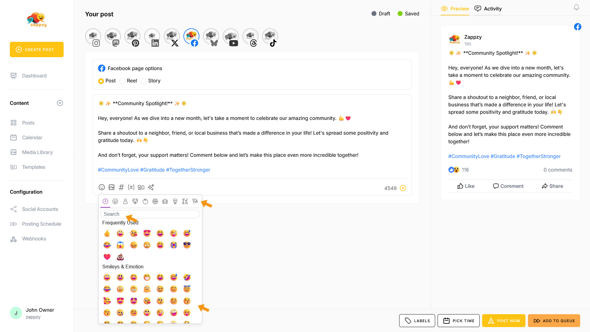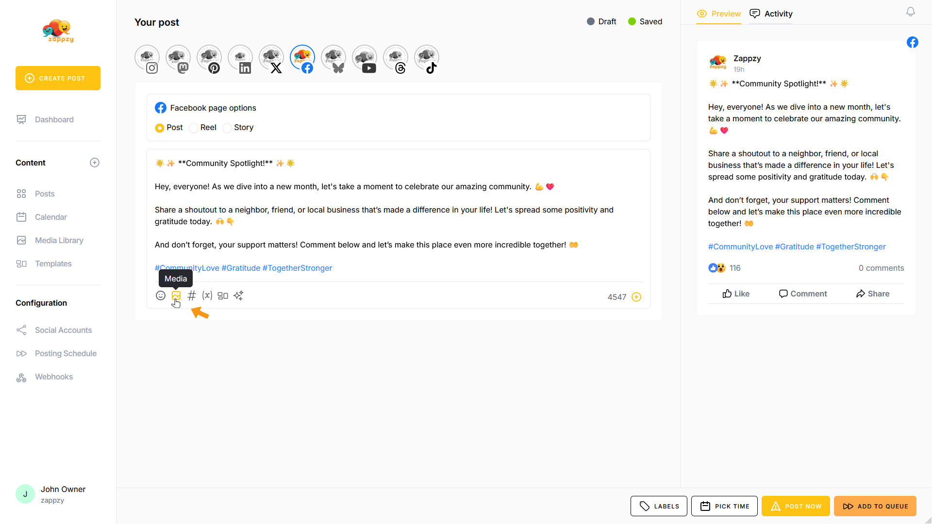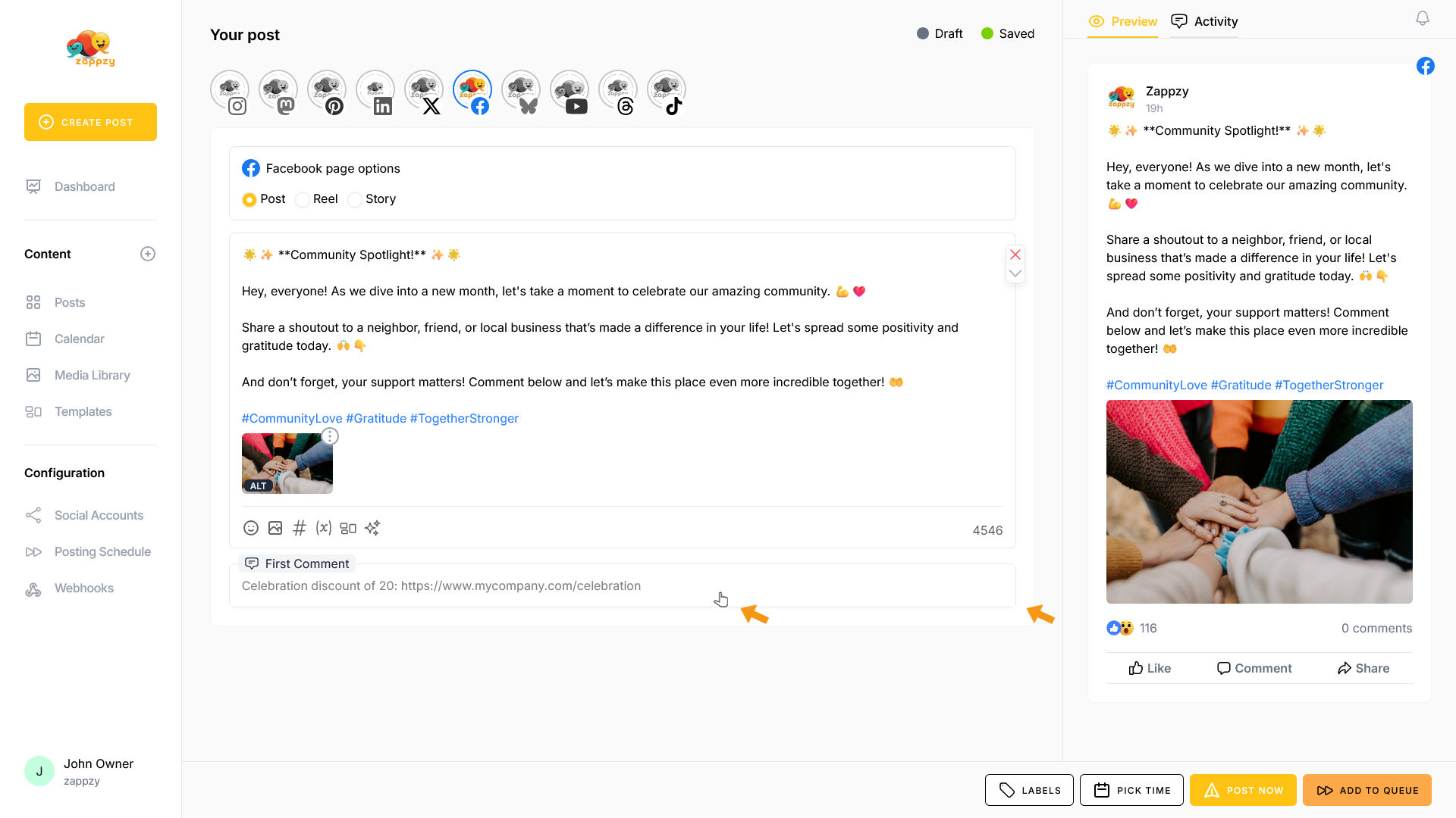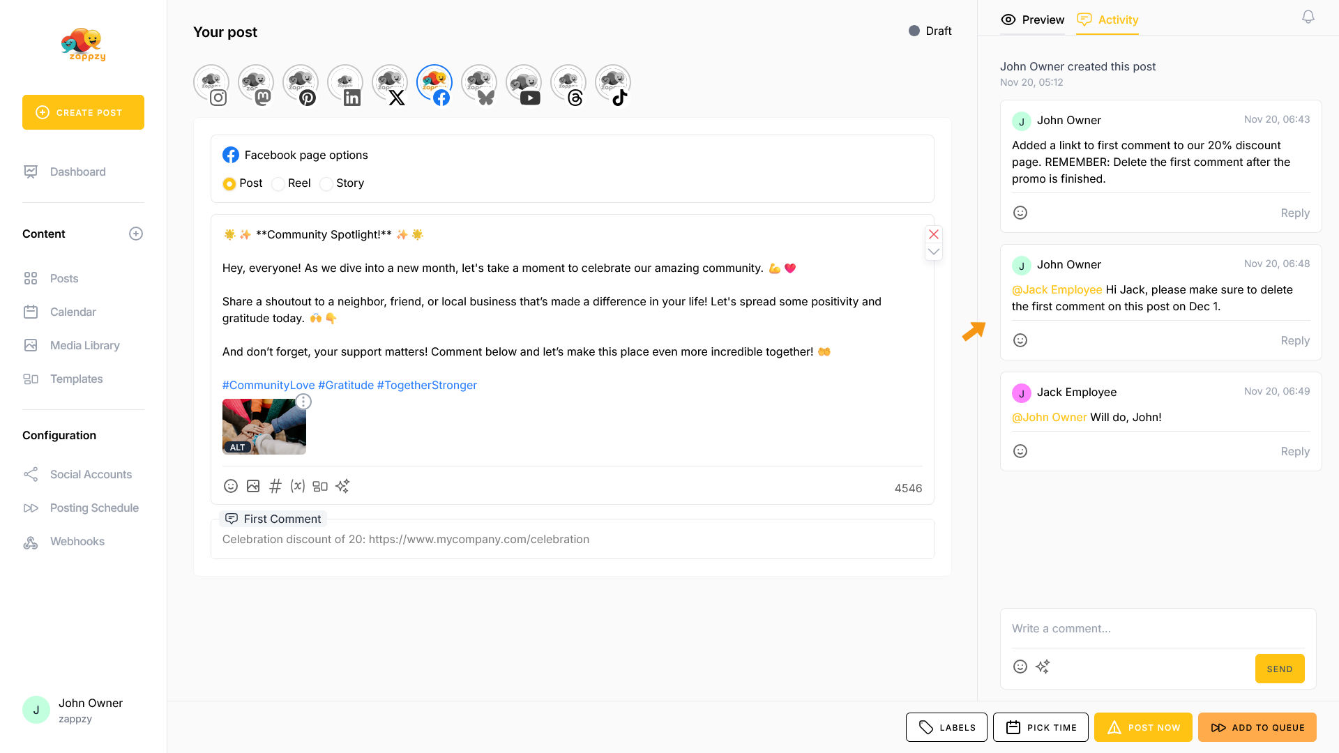 zappzy Support Center > Content > Create posts > Create a post > Create a post on Facebook