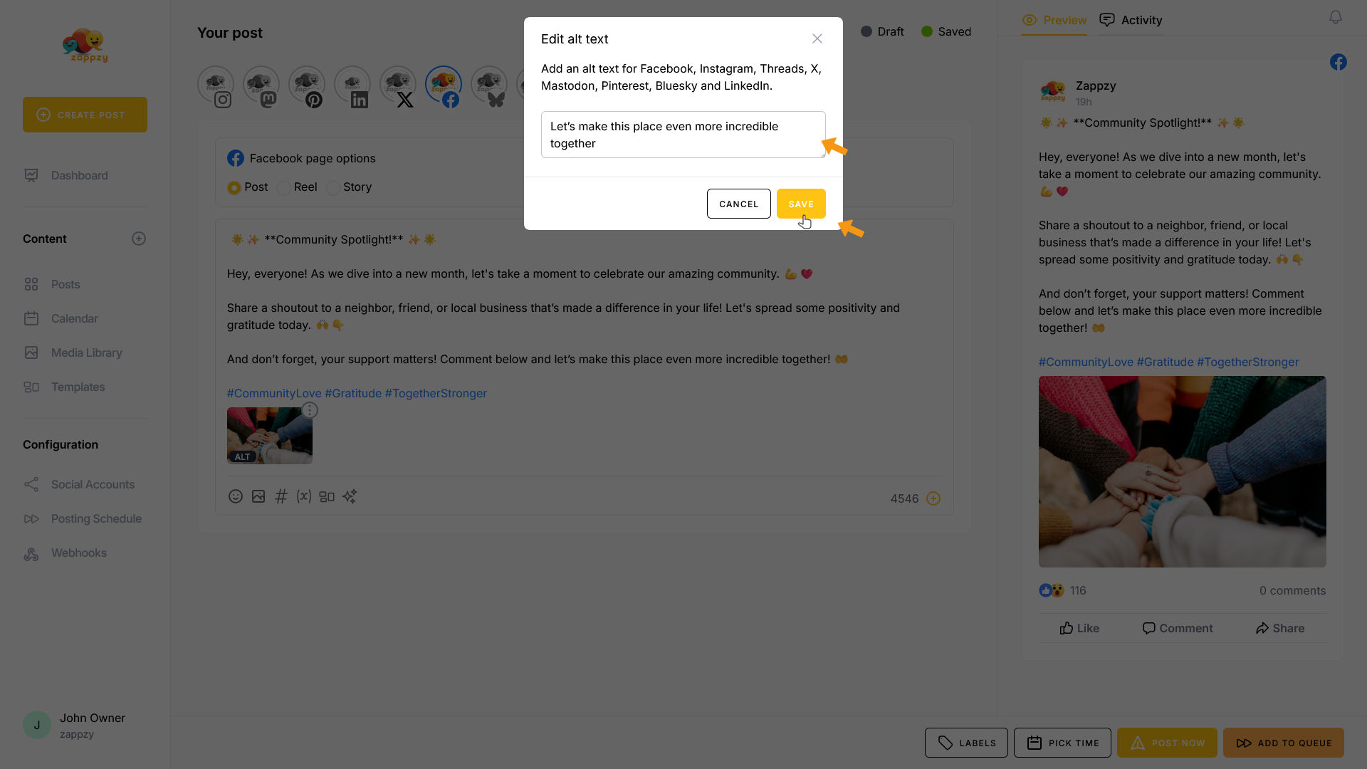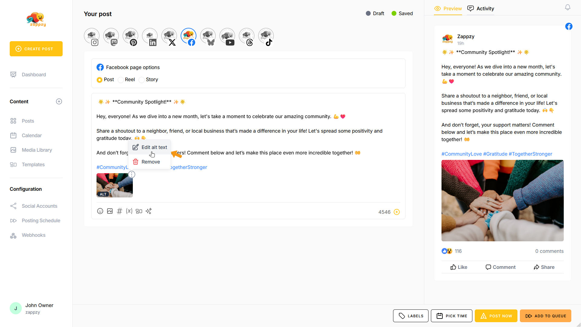 A menu opens with two options: Remove the image (self-explanatory) or Edit alt text—which zappzy will include when posting to Facebook.