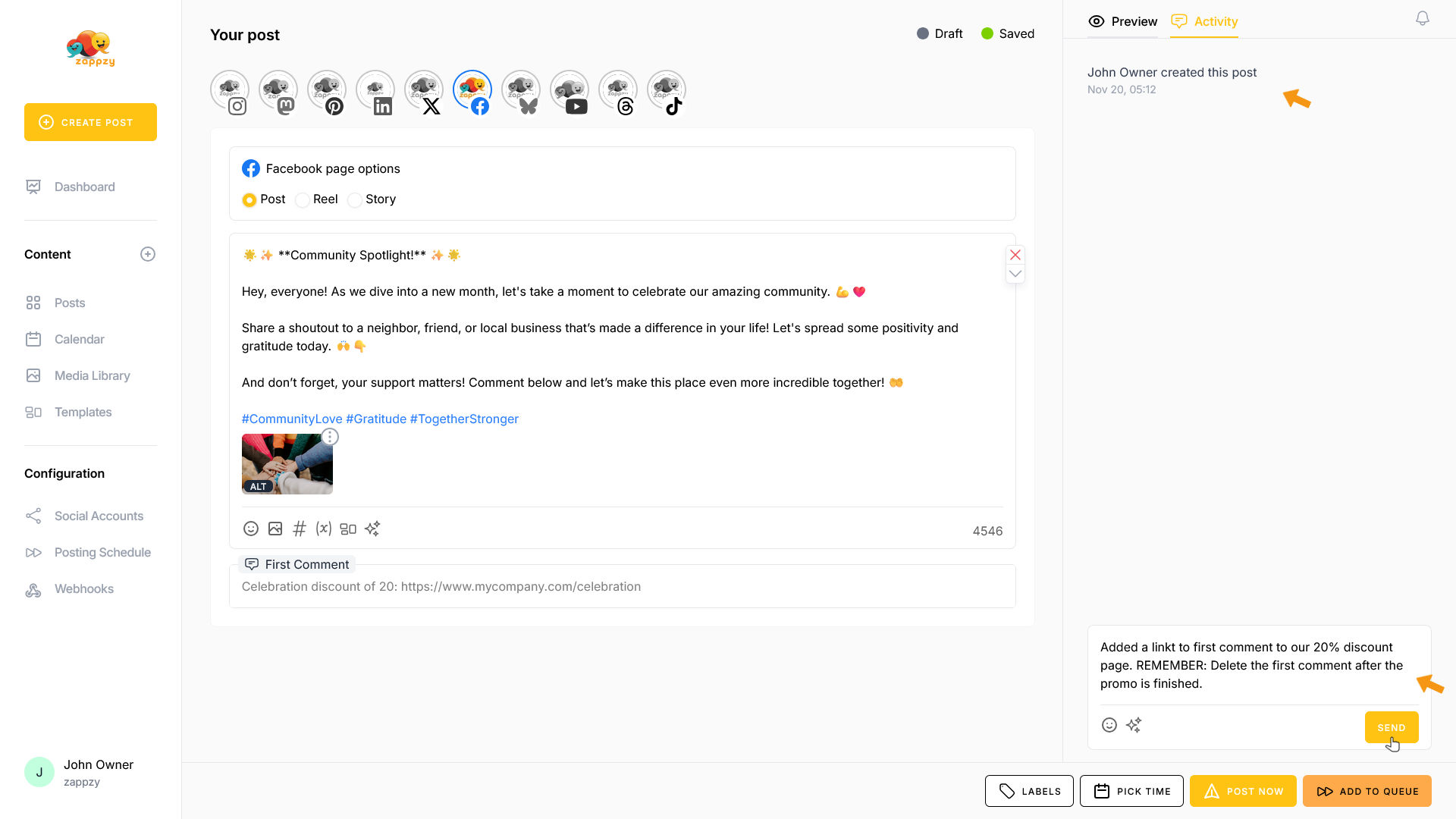 If you have the zappzy BUSINESS plan, the Activity tab is available to all team members. You can communicate with each other, leave feedback, and manage approvals—as explained in the article Approval: How to approve posts.