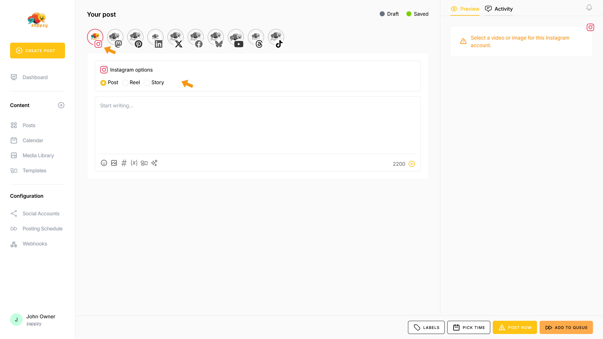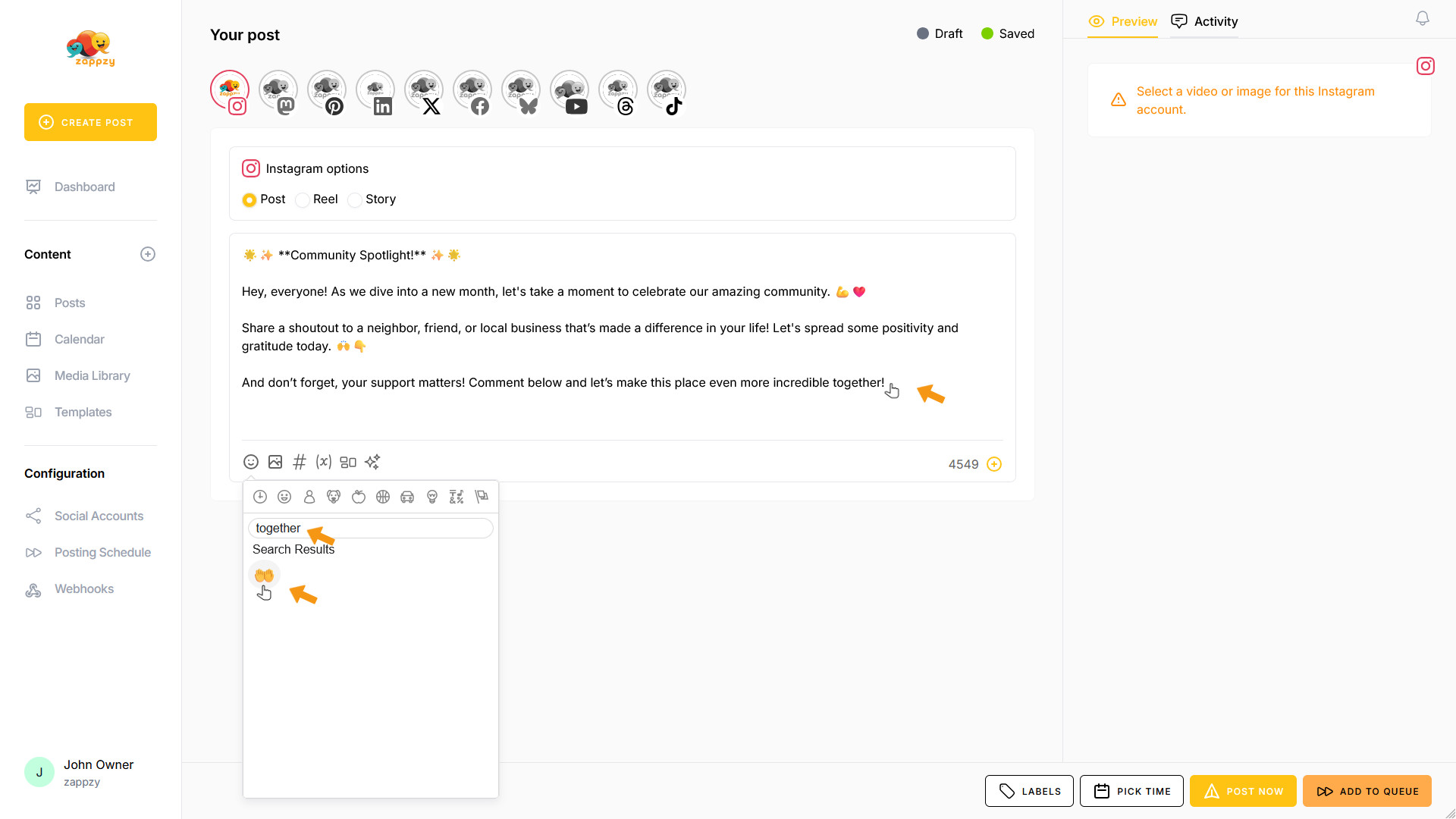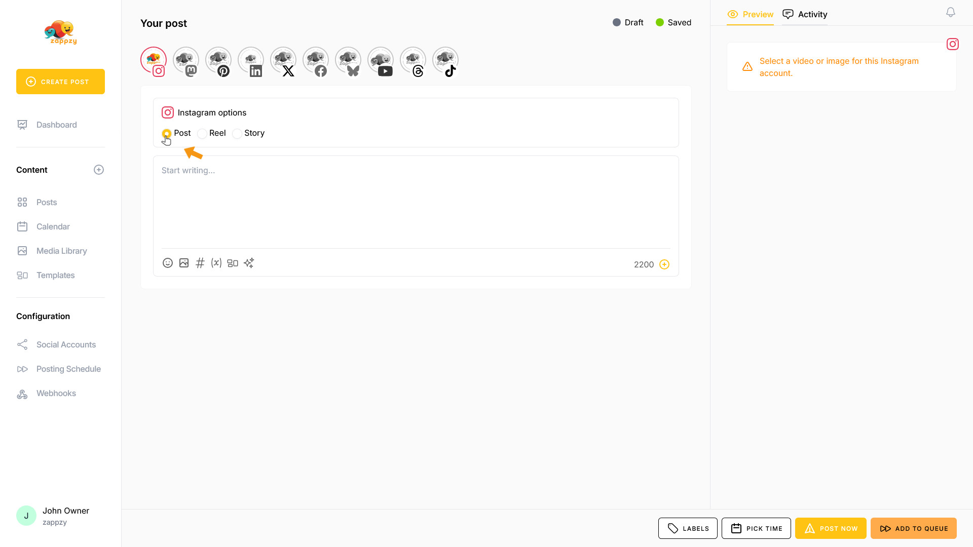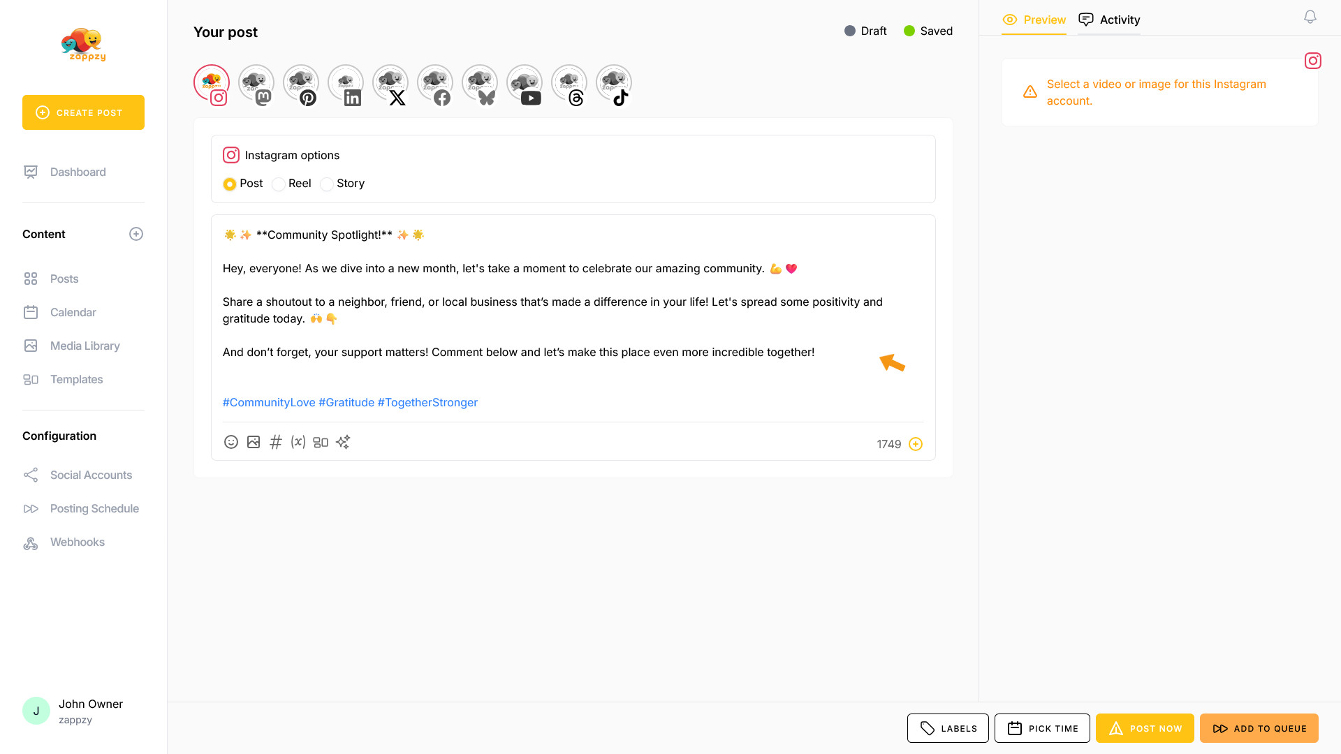 zappzy Support Center > Content > Create posts > Create a post > Create a post on Instagram