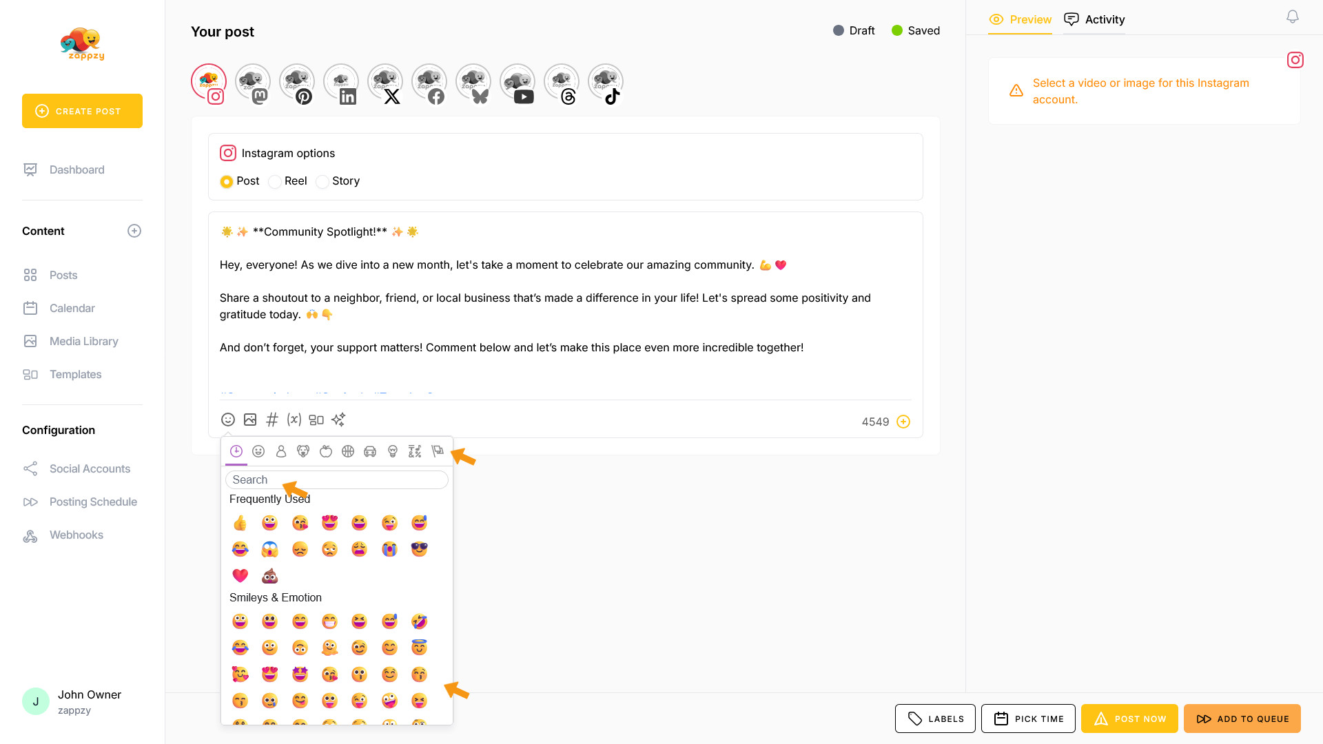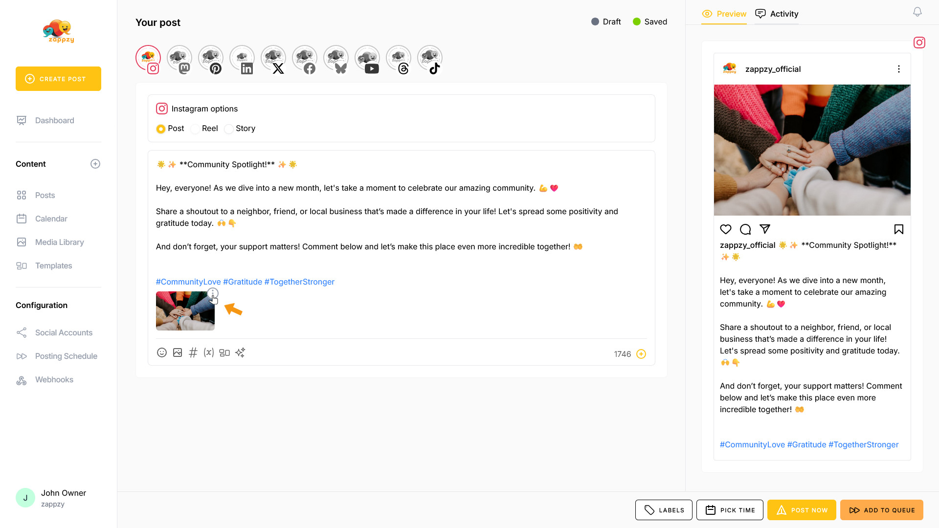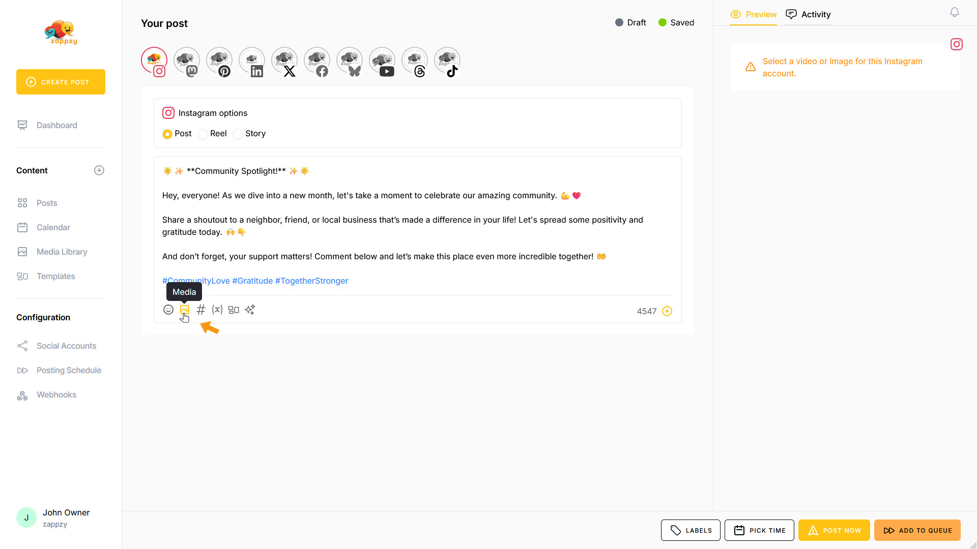 zappzy Support Center > Content > Create posts > Create a post > Create a post on Instagram