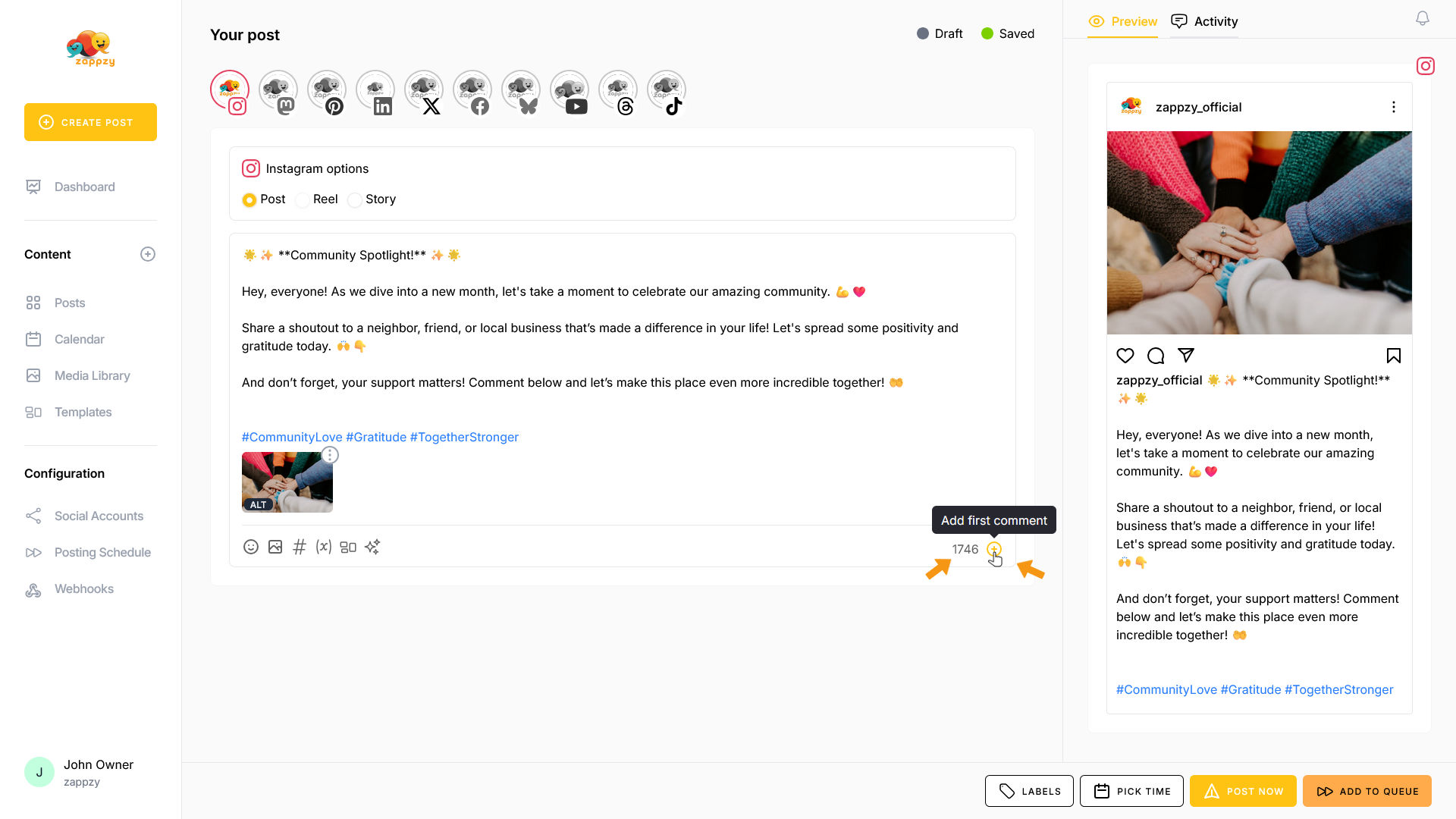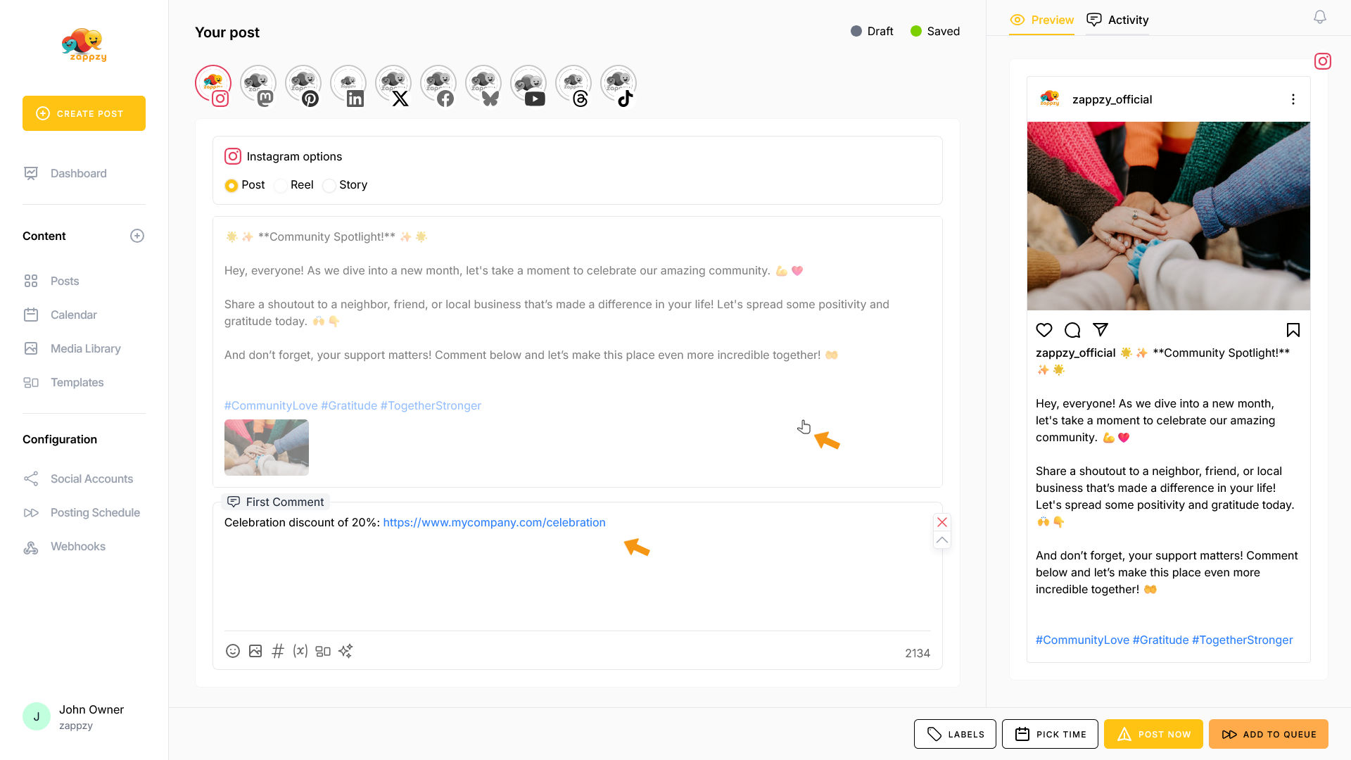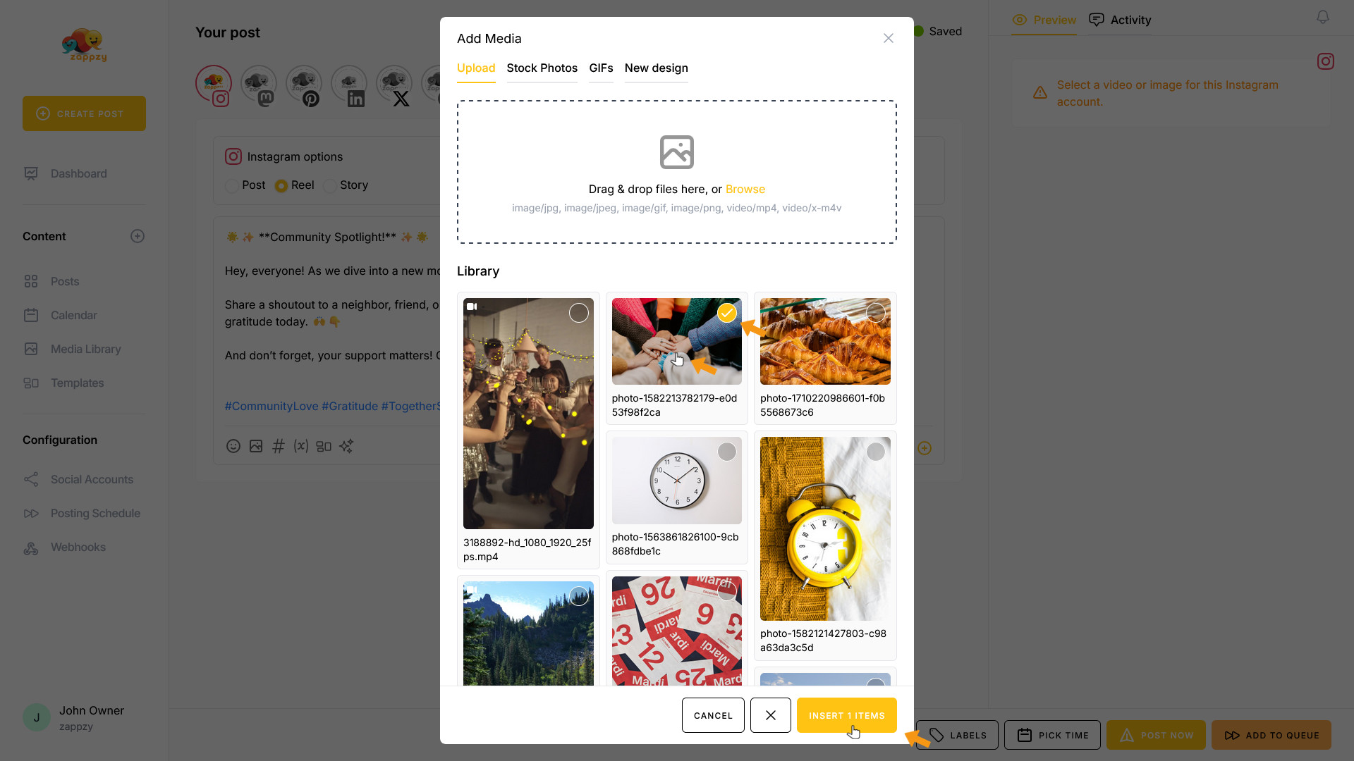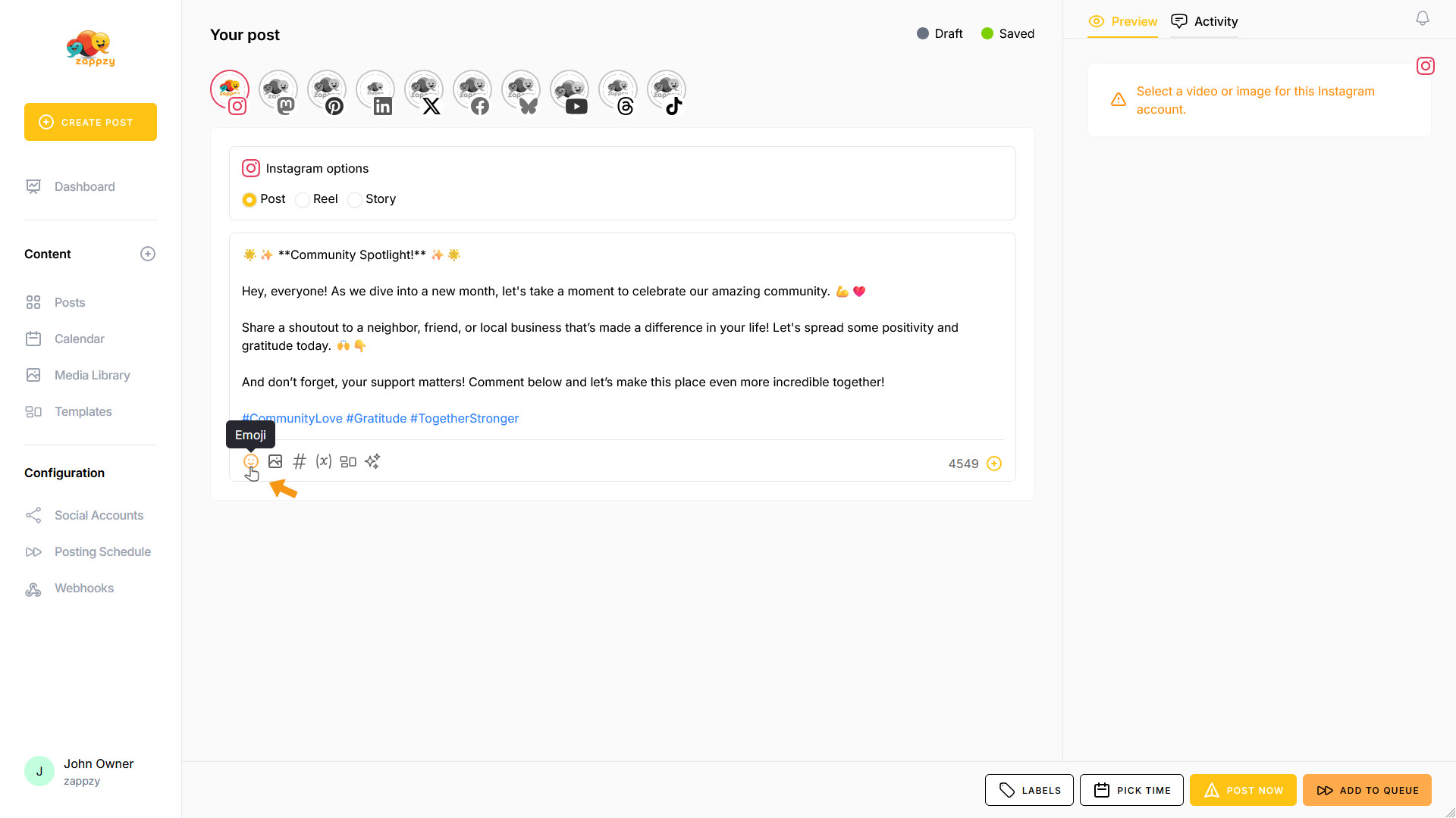 zappzy Support Center > Content > Create posts > Create a post > Create a post on Instagram