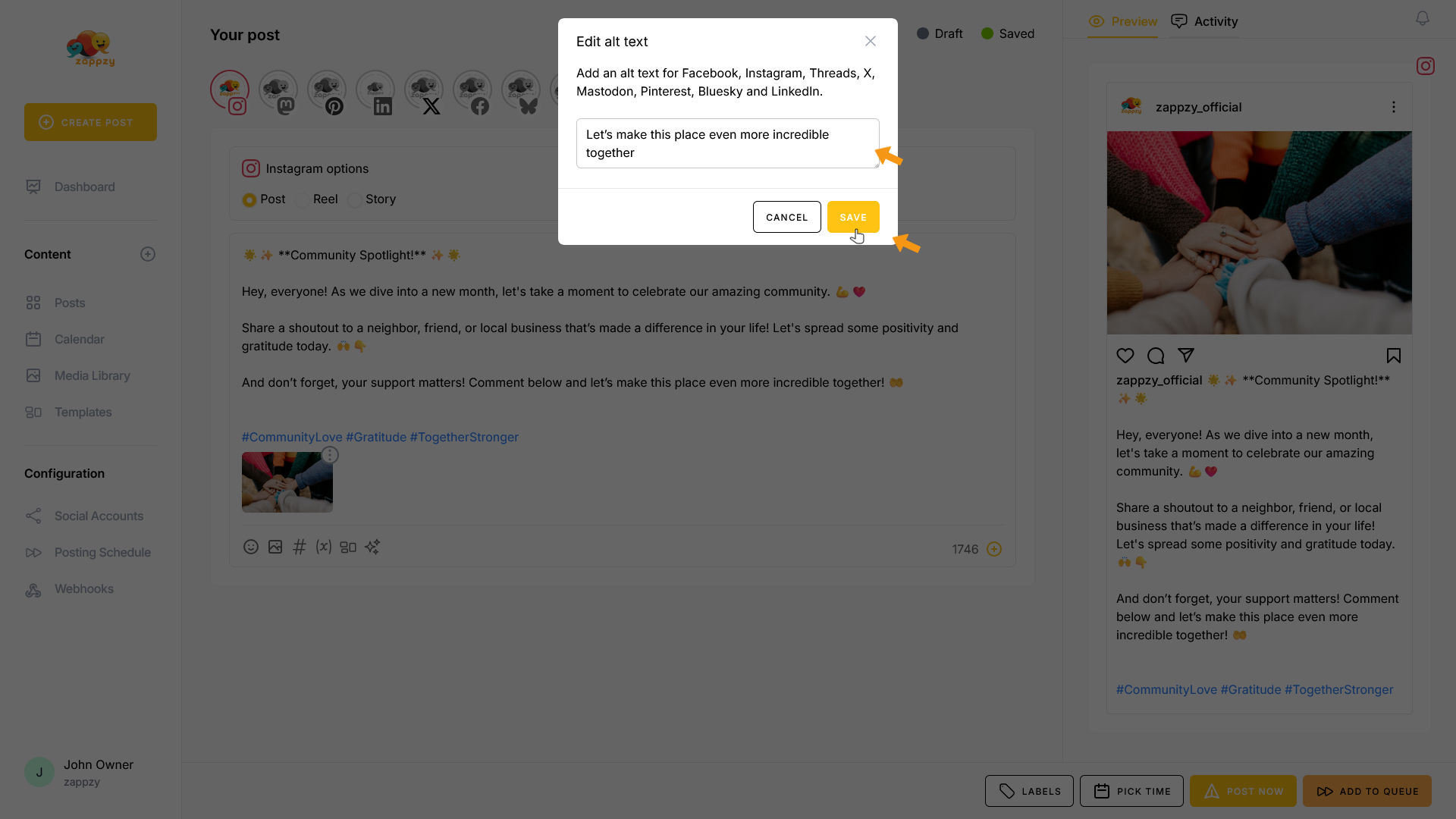 A menu opens with two options: Remove the image (self-explanatory) or Edit alt text—which zappzy will include when posting to Instagram.