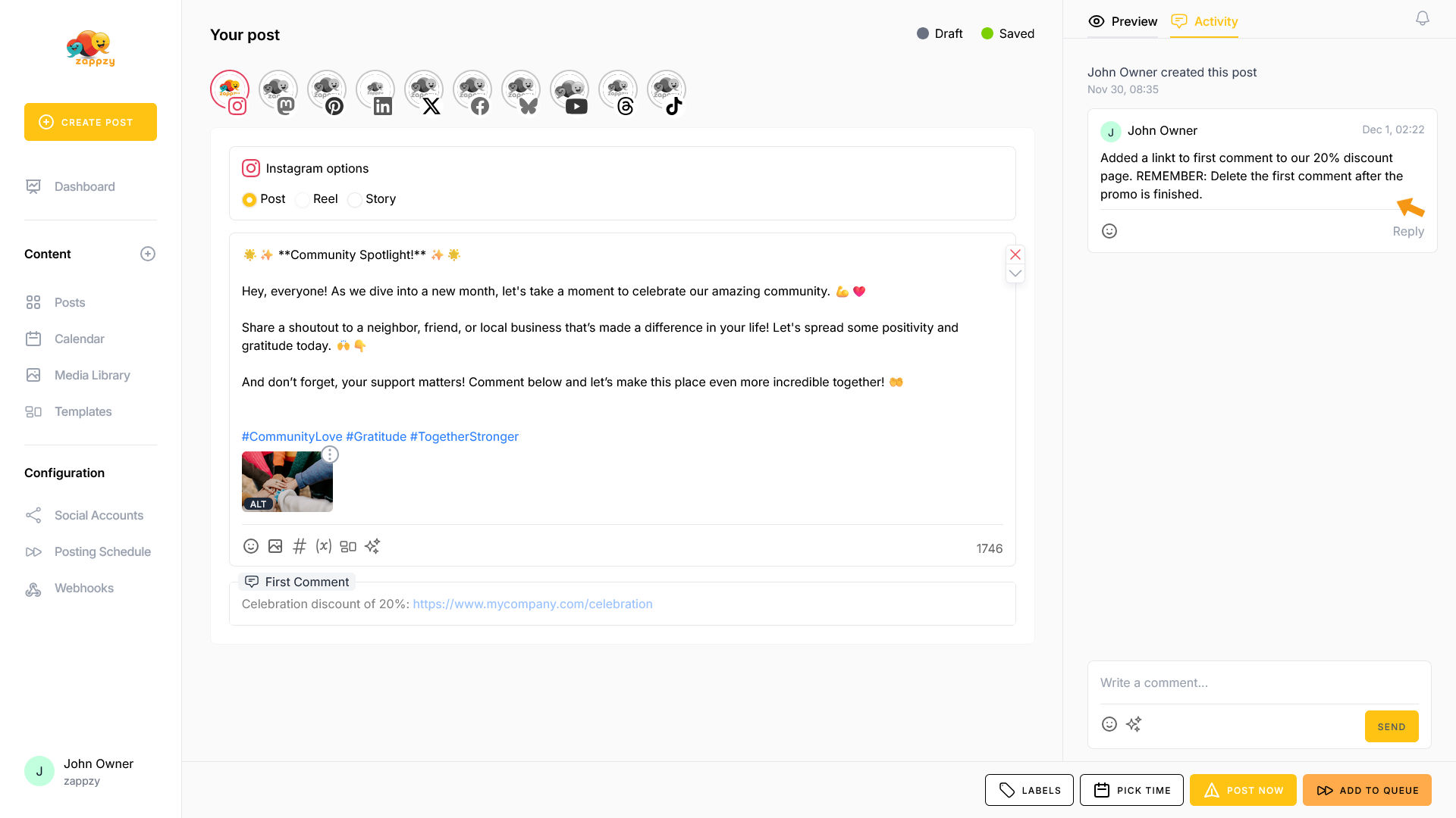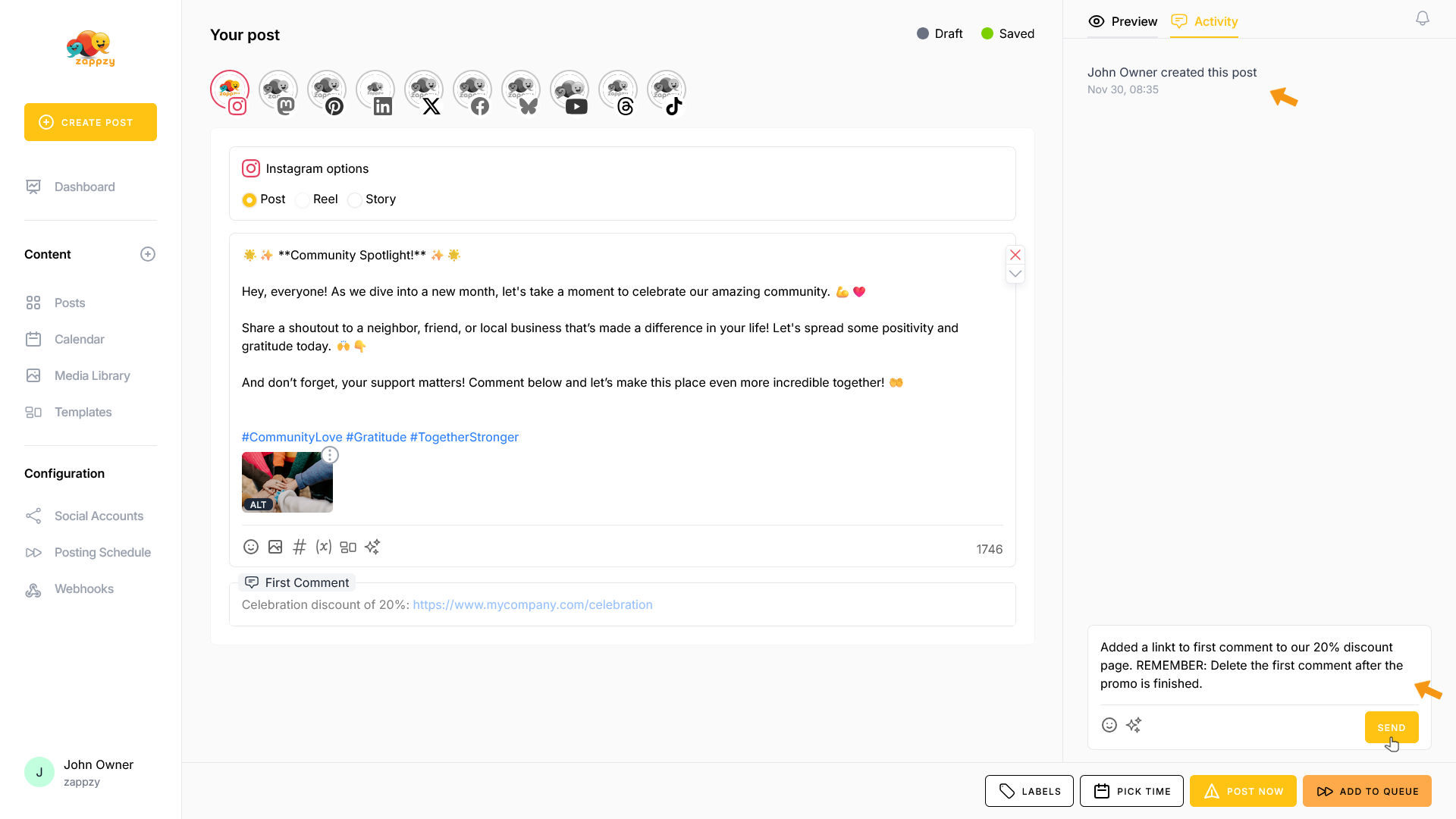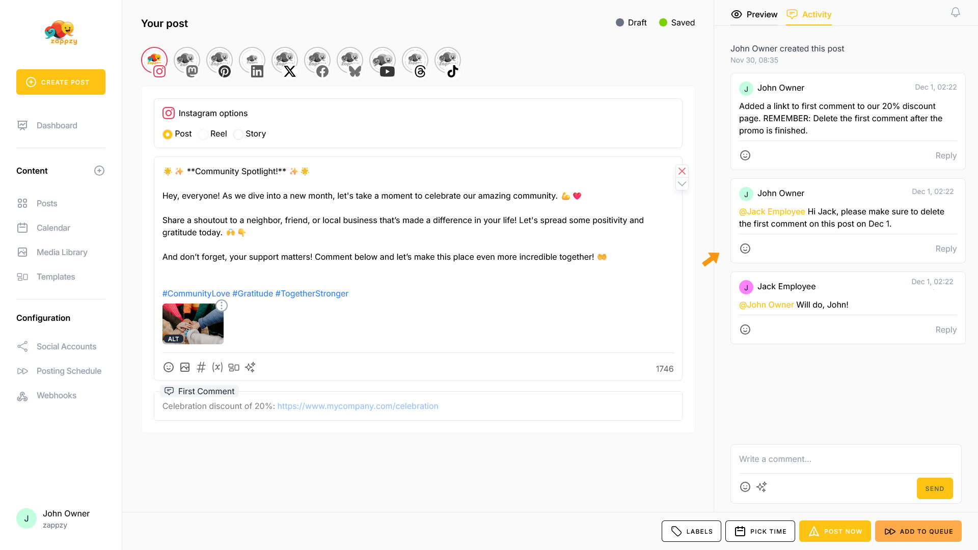 If you have the zappzy BUSINESS plan, the Activity tab is available to all team members. You can communicate with each other, leave feedback, and manage approvals—as explained in the article Approval: How to approve posts.