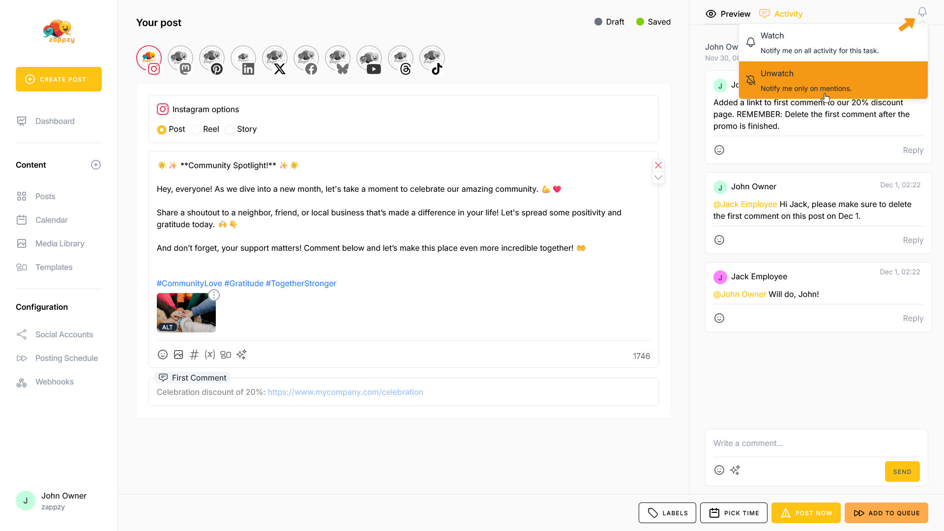 One last feature: at the top right, you'll see the bell icon. Here you can choose whether you want to be notified for all activity on this post or only when you're mentioned. This feature is especially useful for zappzy BUSINESS plan users.