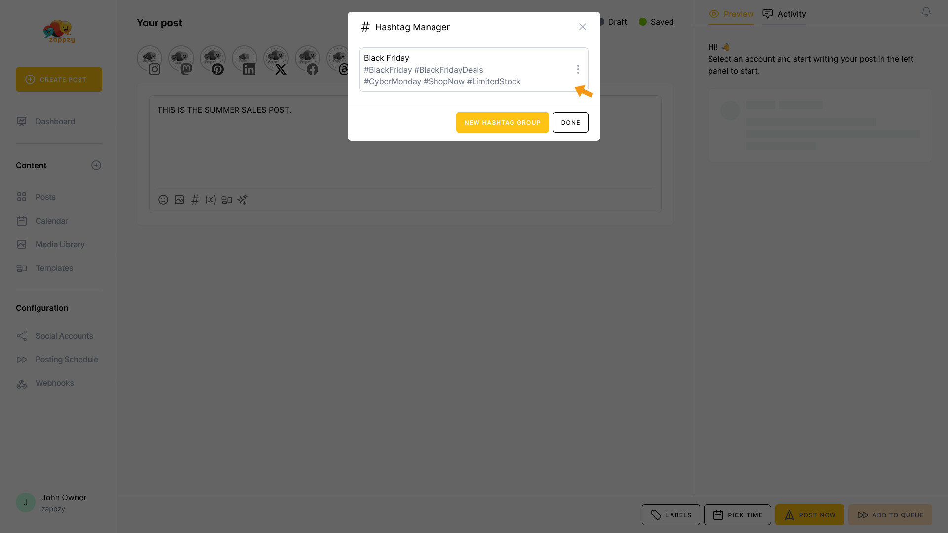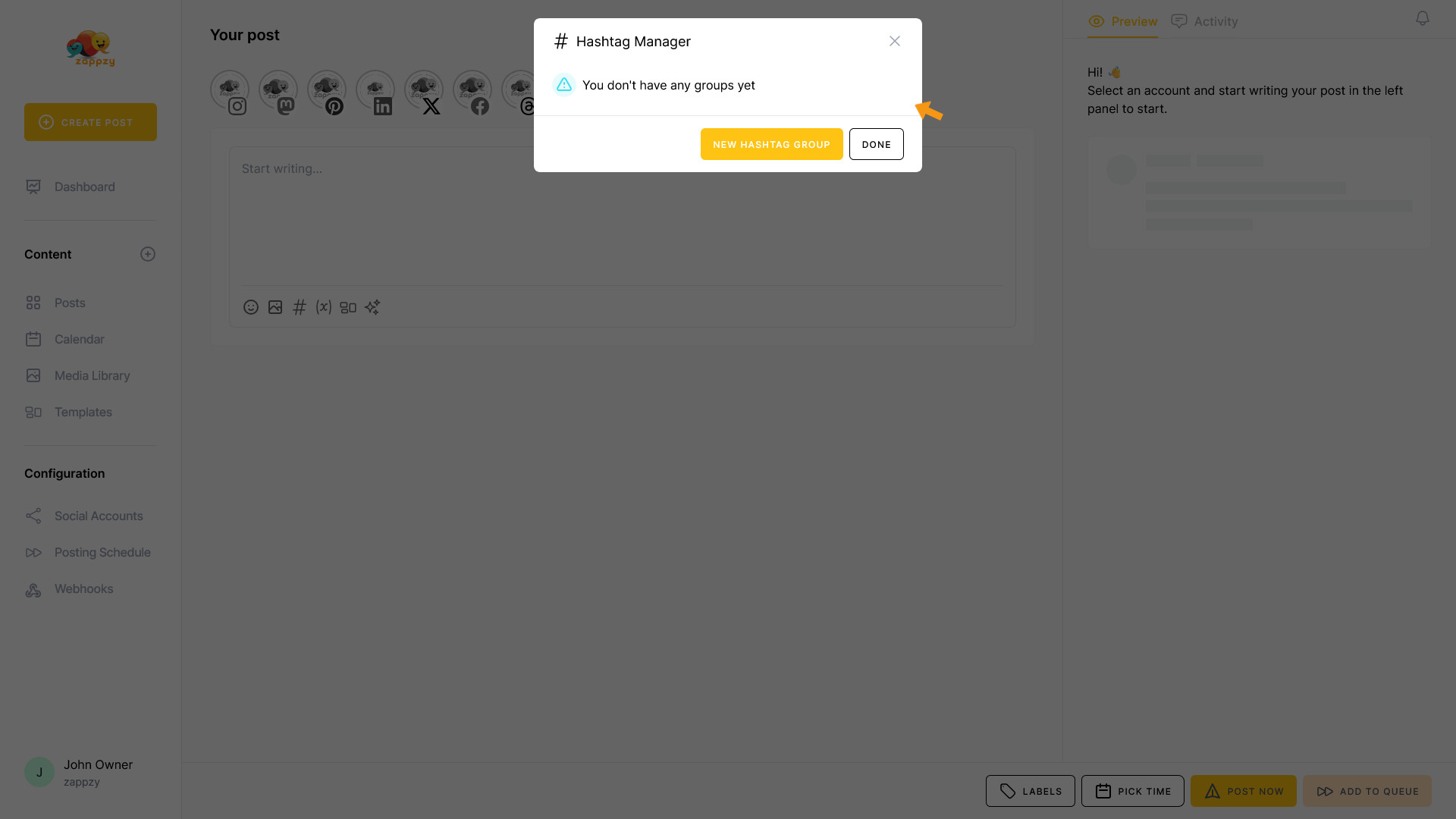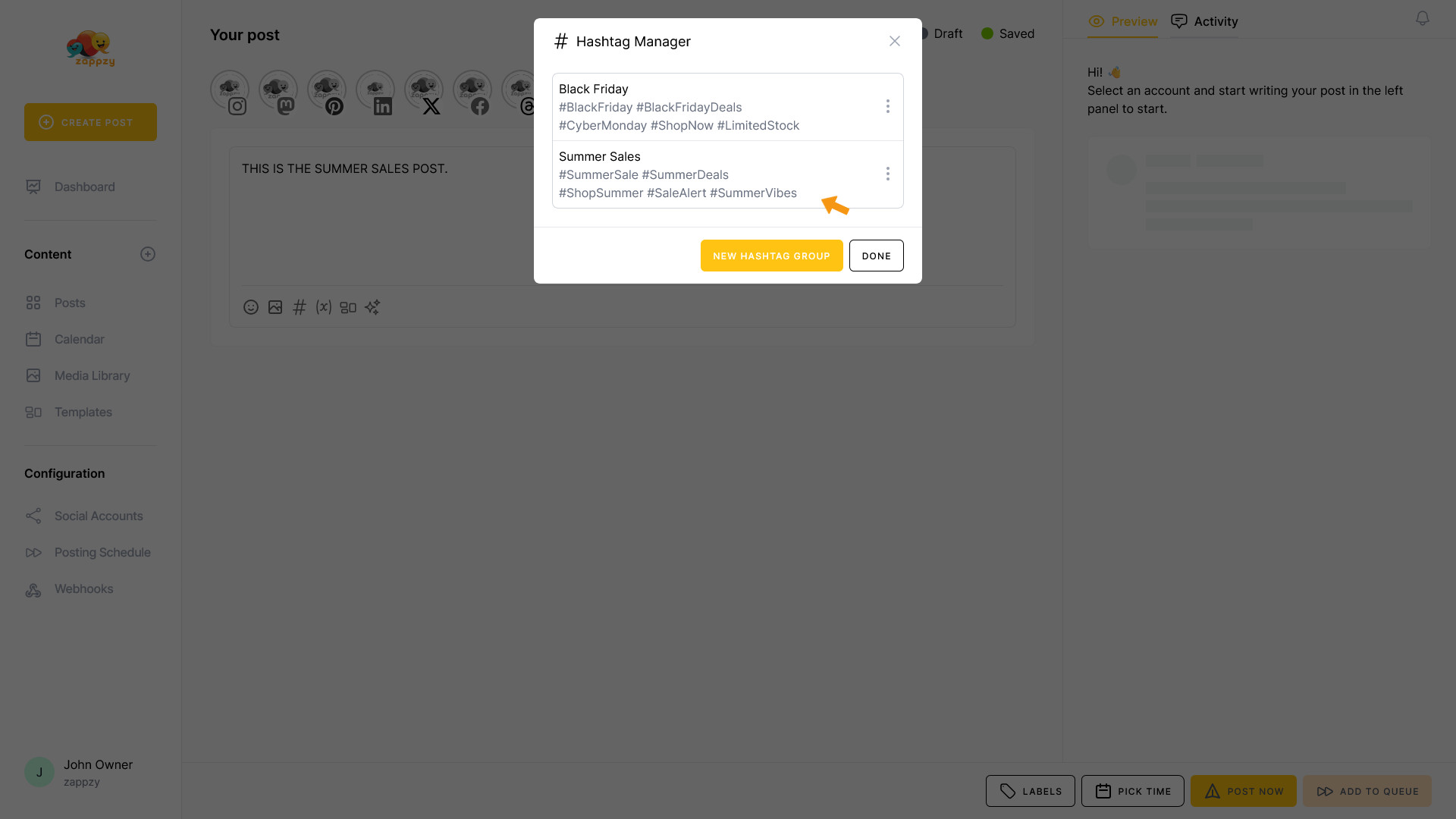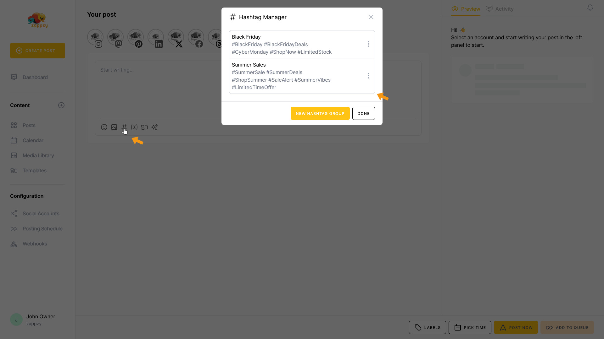 zappzy Support Center > Content > Create posts > Hashtag Manager: Create groups, insert tags, and manage your hashtag strategy