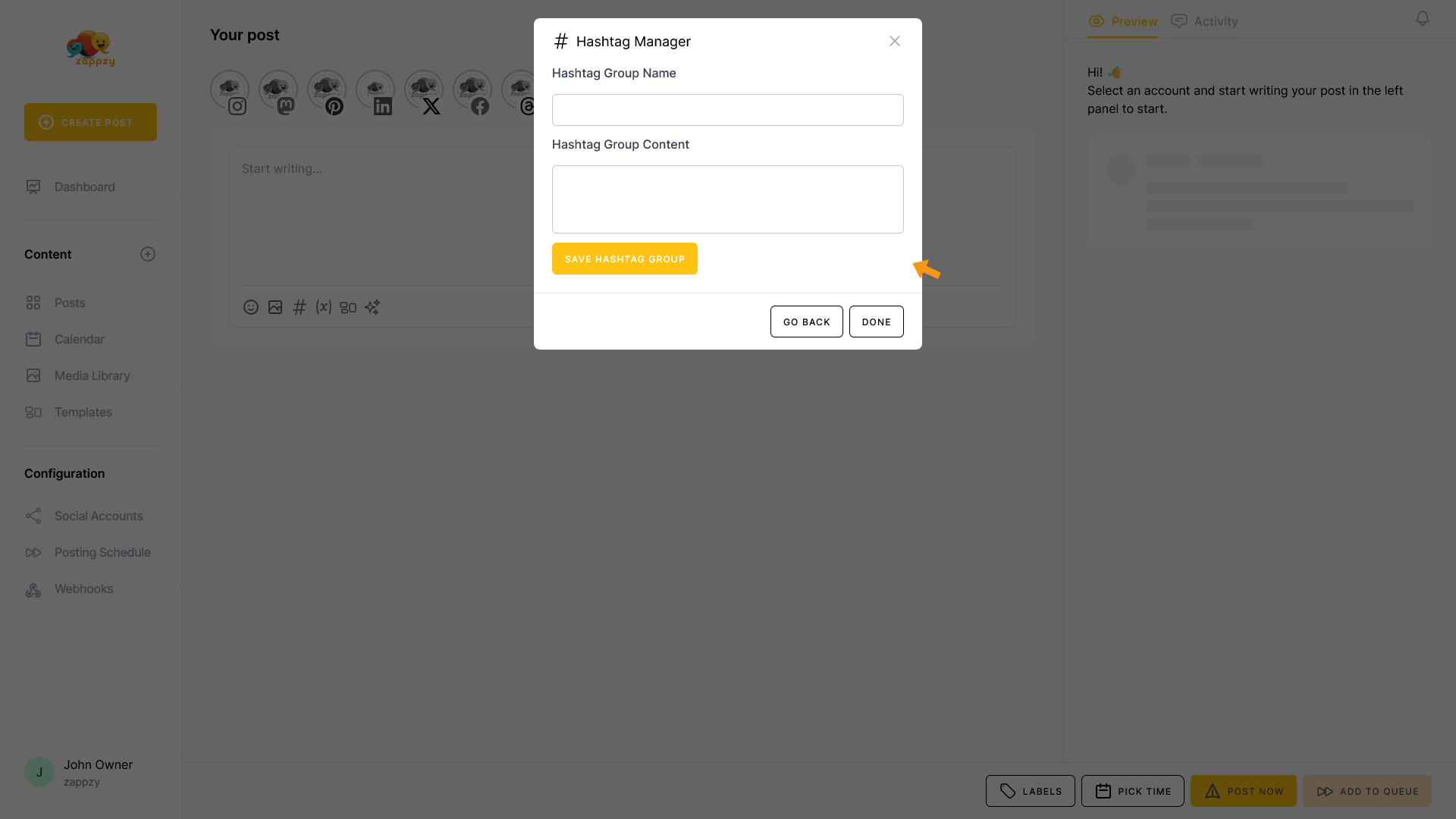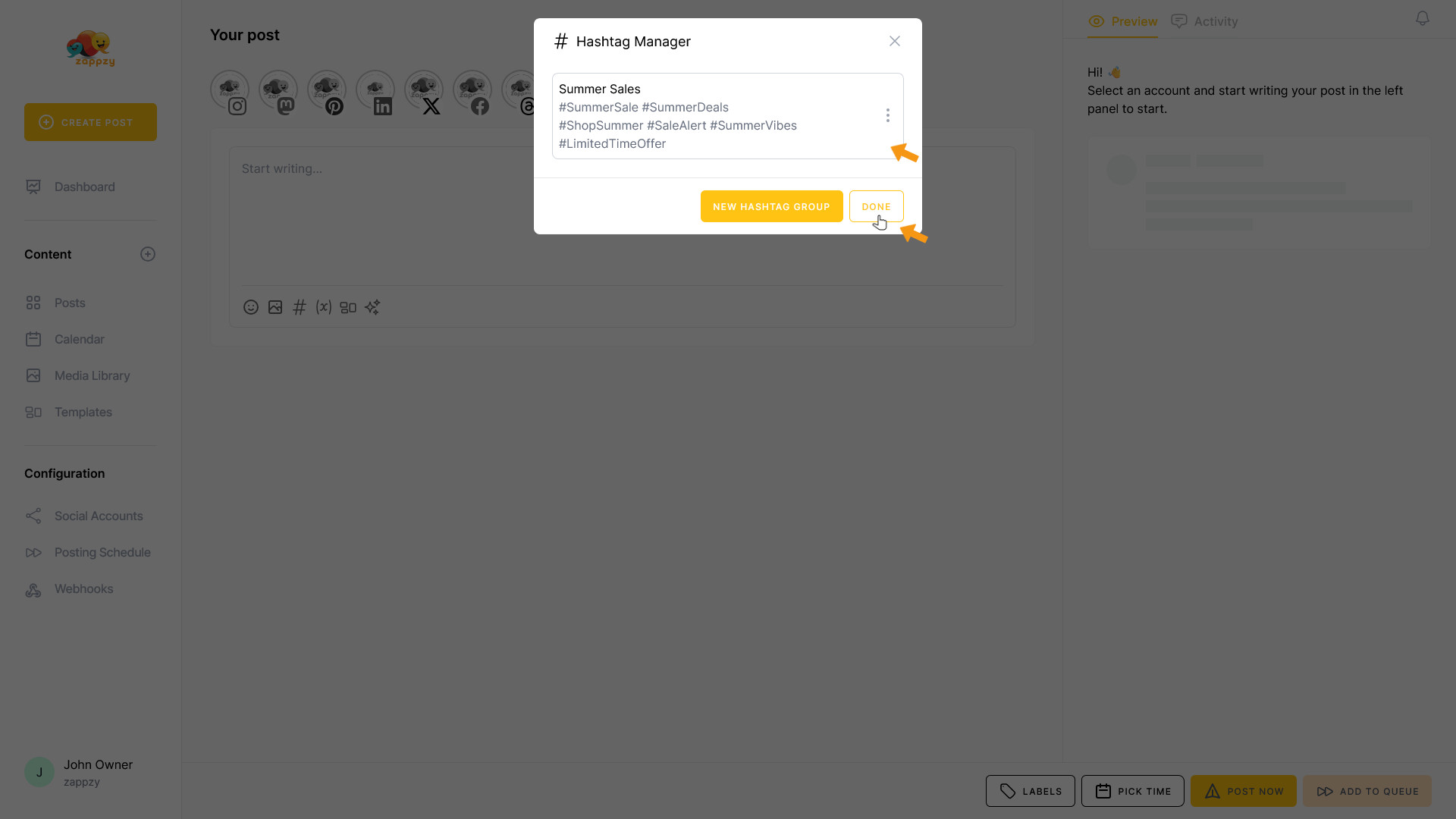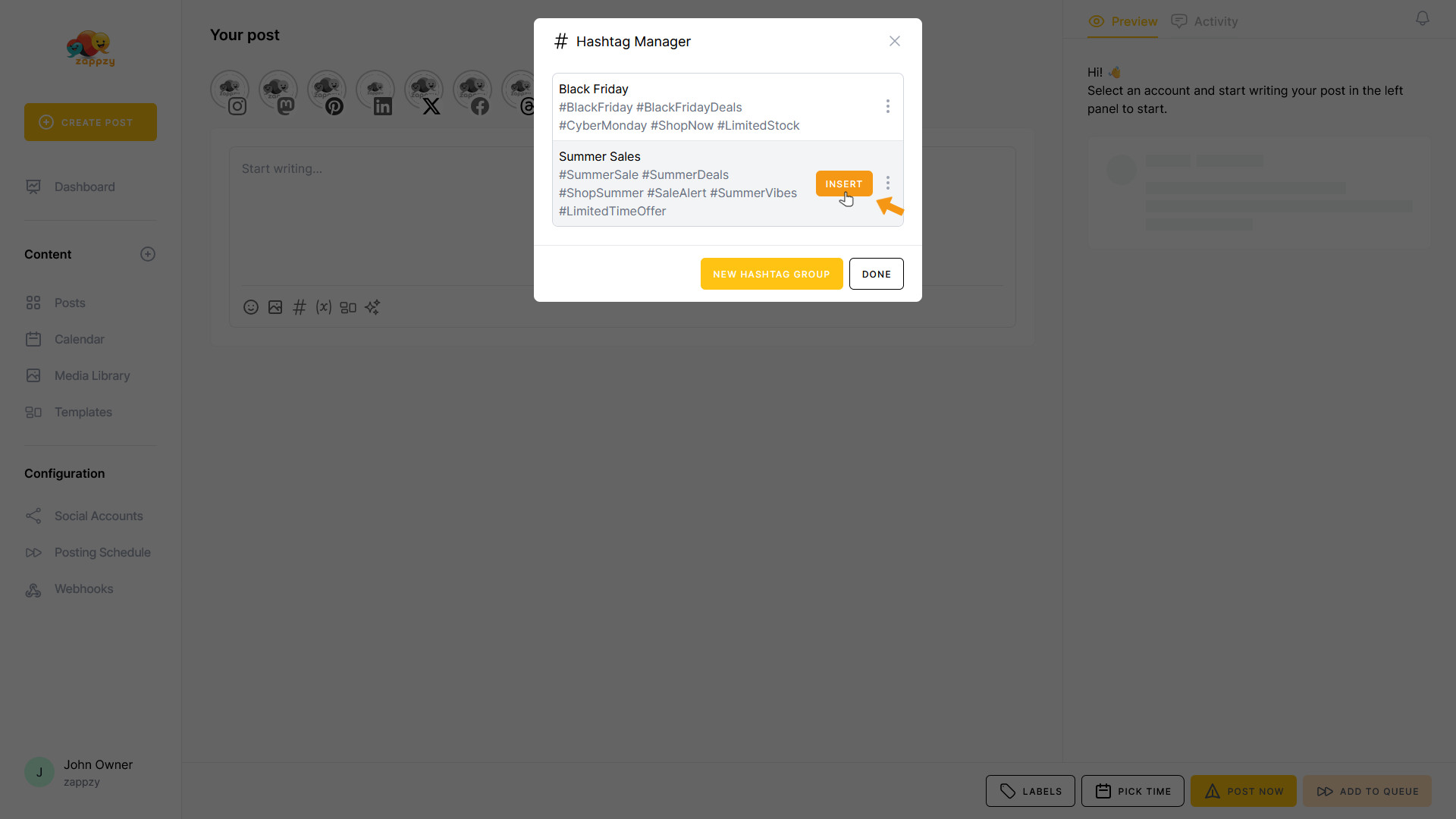 zappzy Support Center > Content > Create posts > Hashtag Manager: Create groups, insert tags, and manage your hashtag strategy