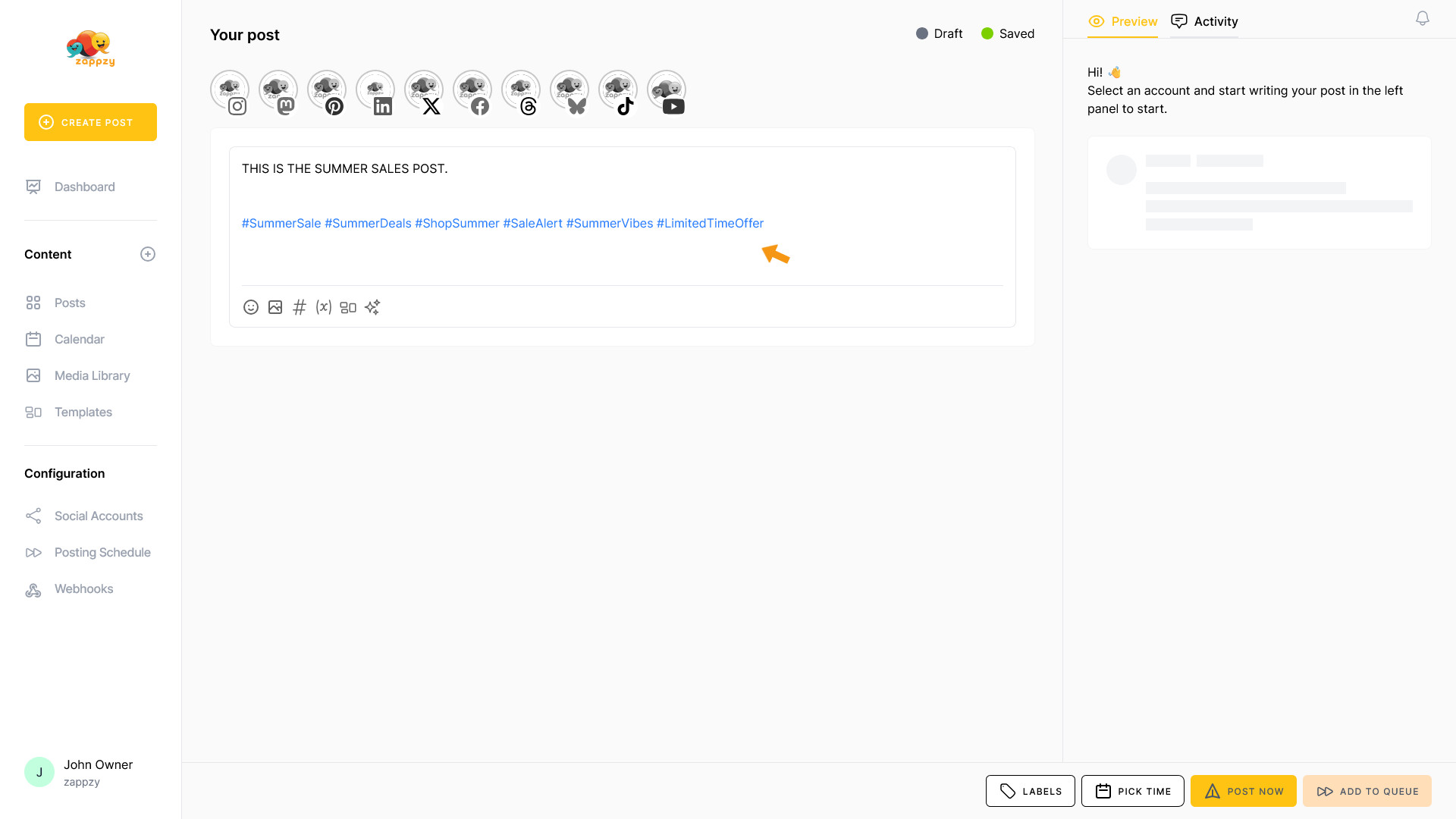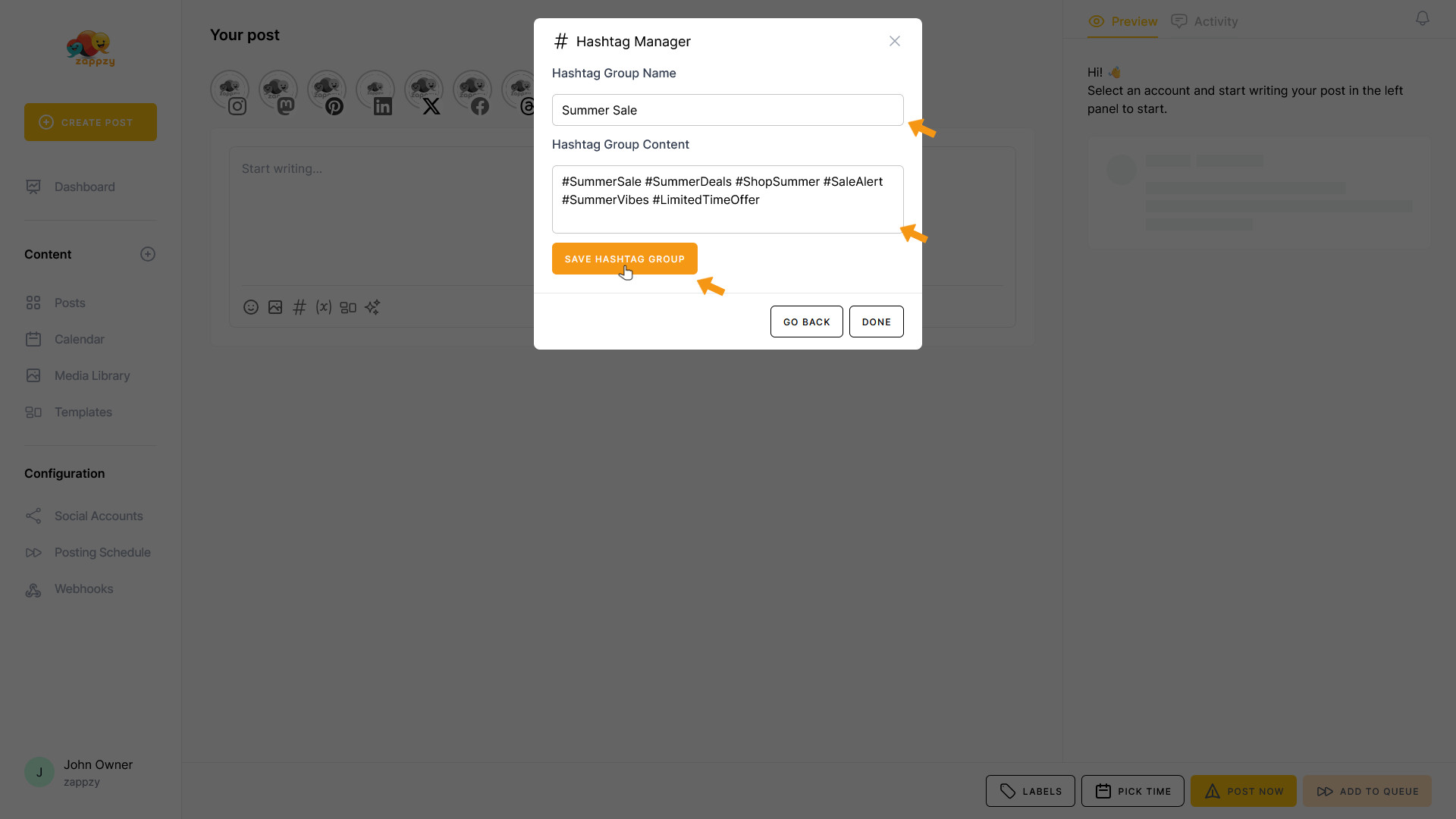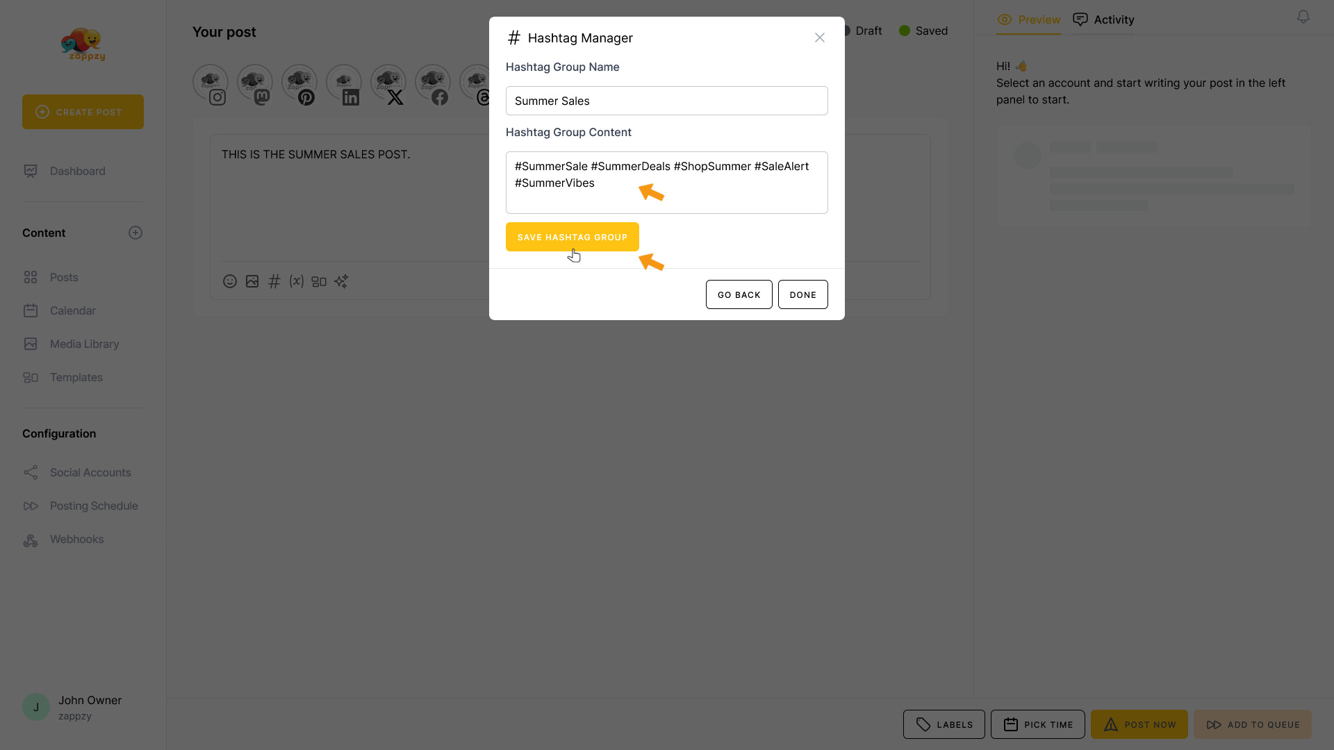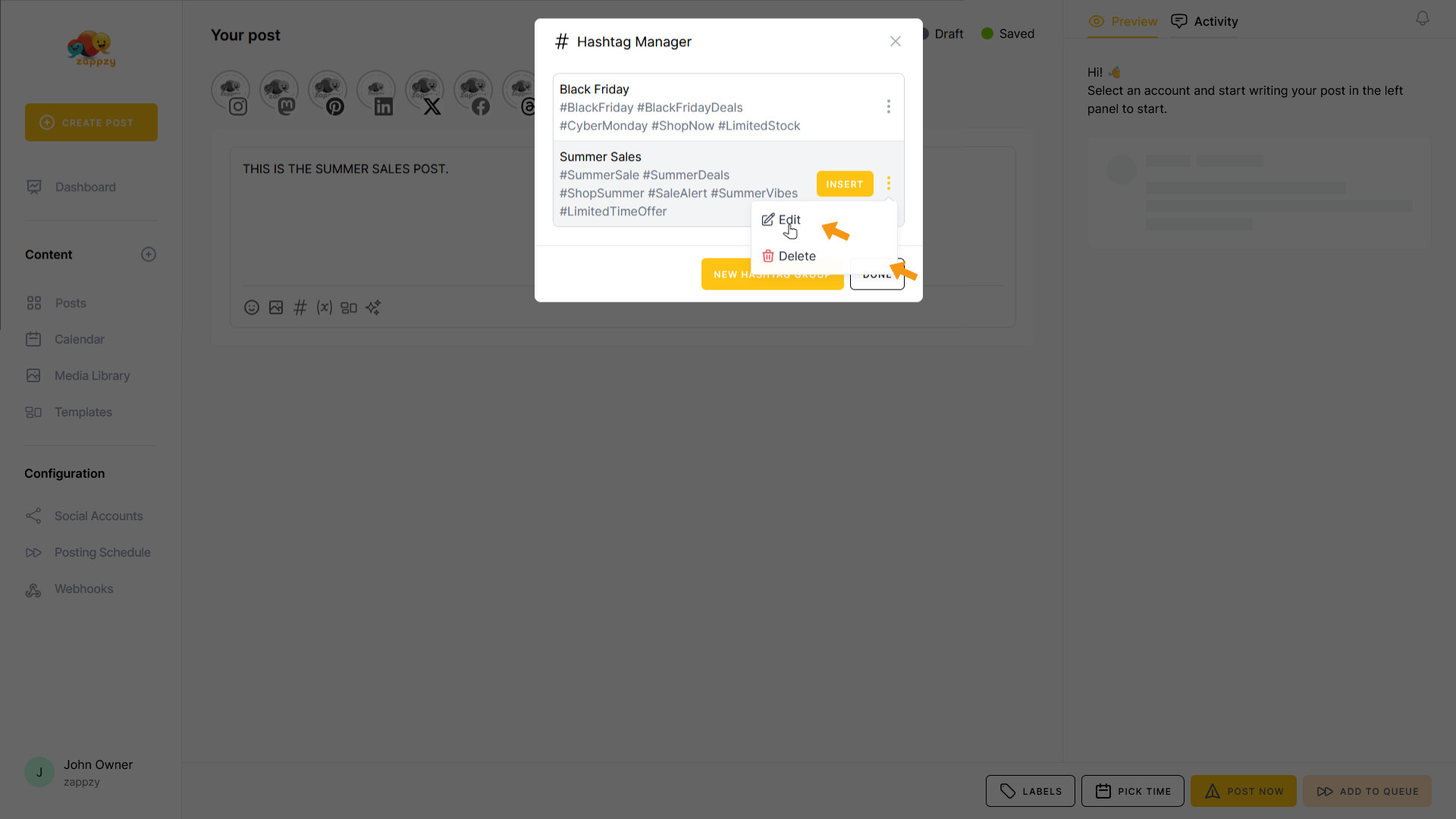 zappzy Support Center > Content > Create posts > Hashtag Manager: Create groups, insert tags, and manage your hashtag strategy