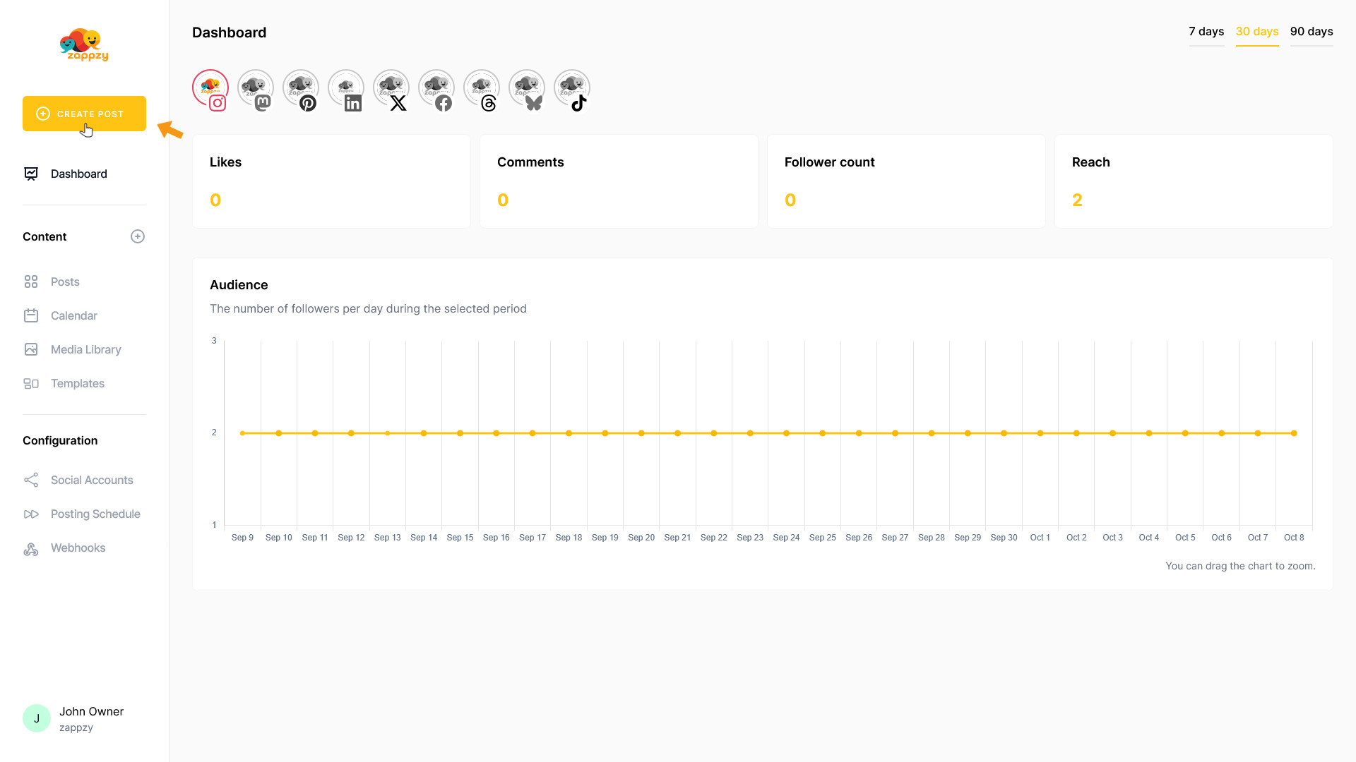 Once you're logged in to zappzy, you'll see an orange CREATE POST button in the left menu. Click on it.