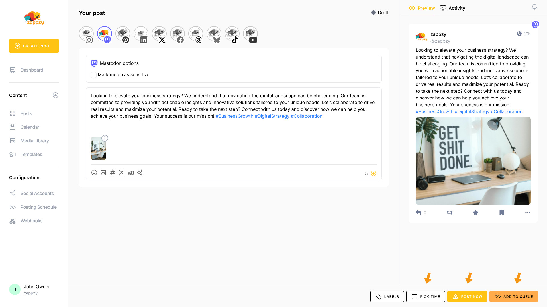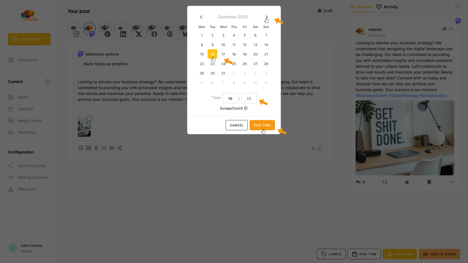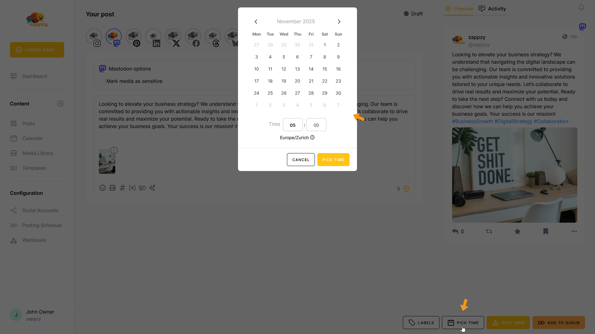 zappzy Support Center > Content > Create posts > Post timing: Pick Time, Post now, and Add to queue