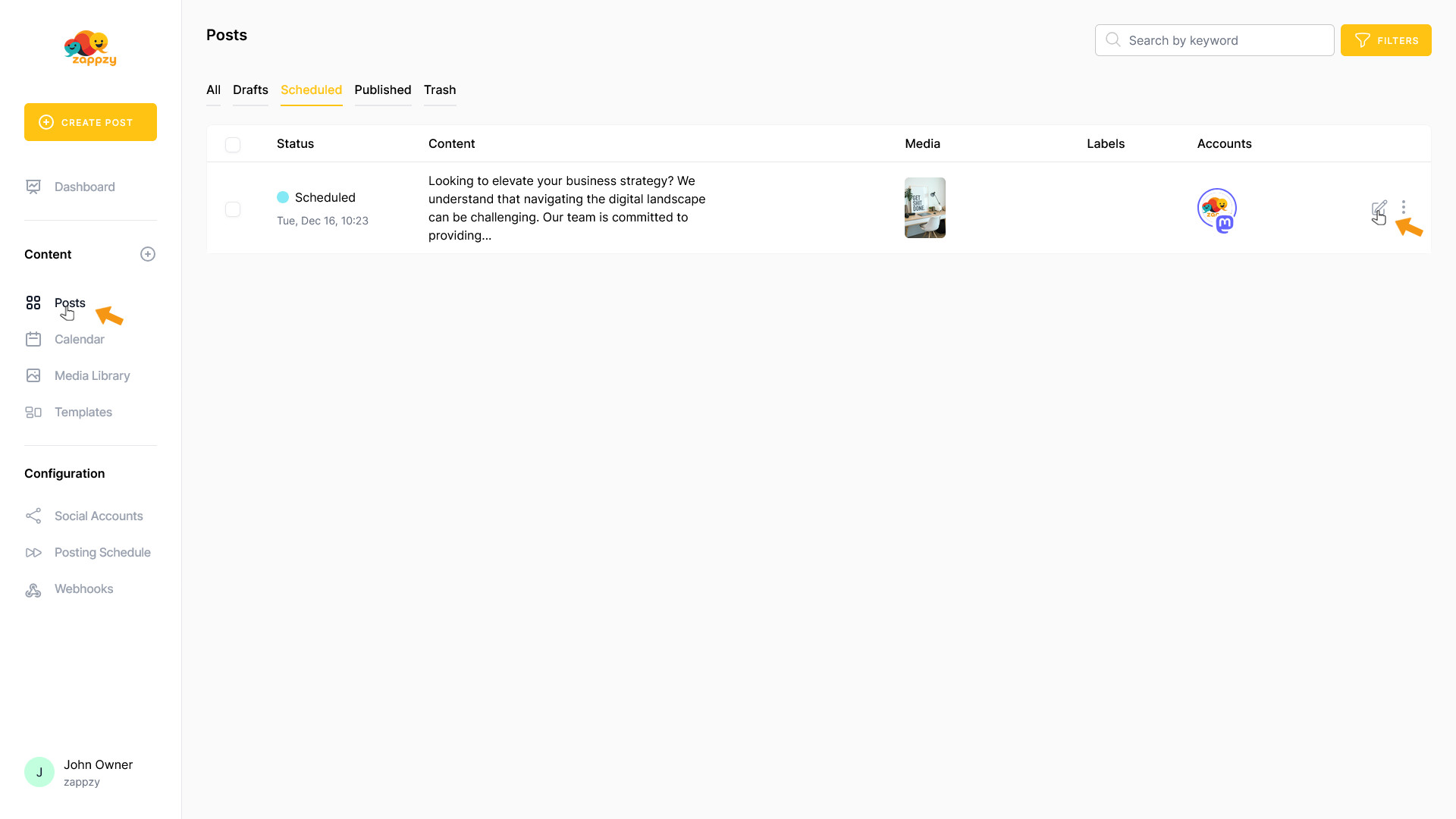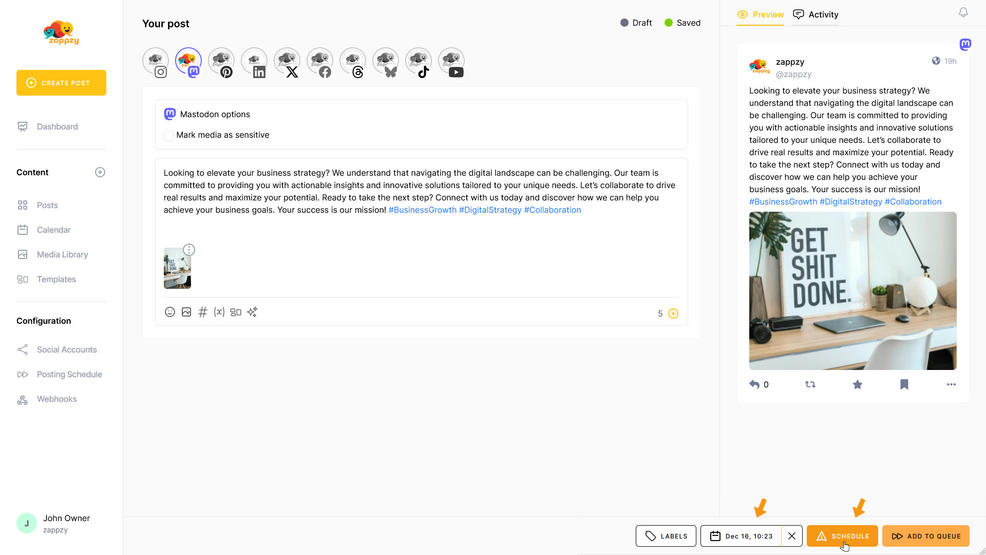 When you click ADD TO QUEUE, you hand over your created post to this Posting Schedule and zappzy will automatically publish your post based on your planned timing.