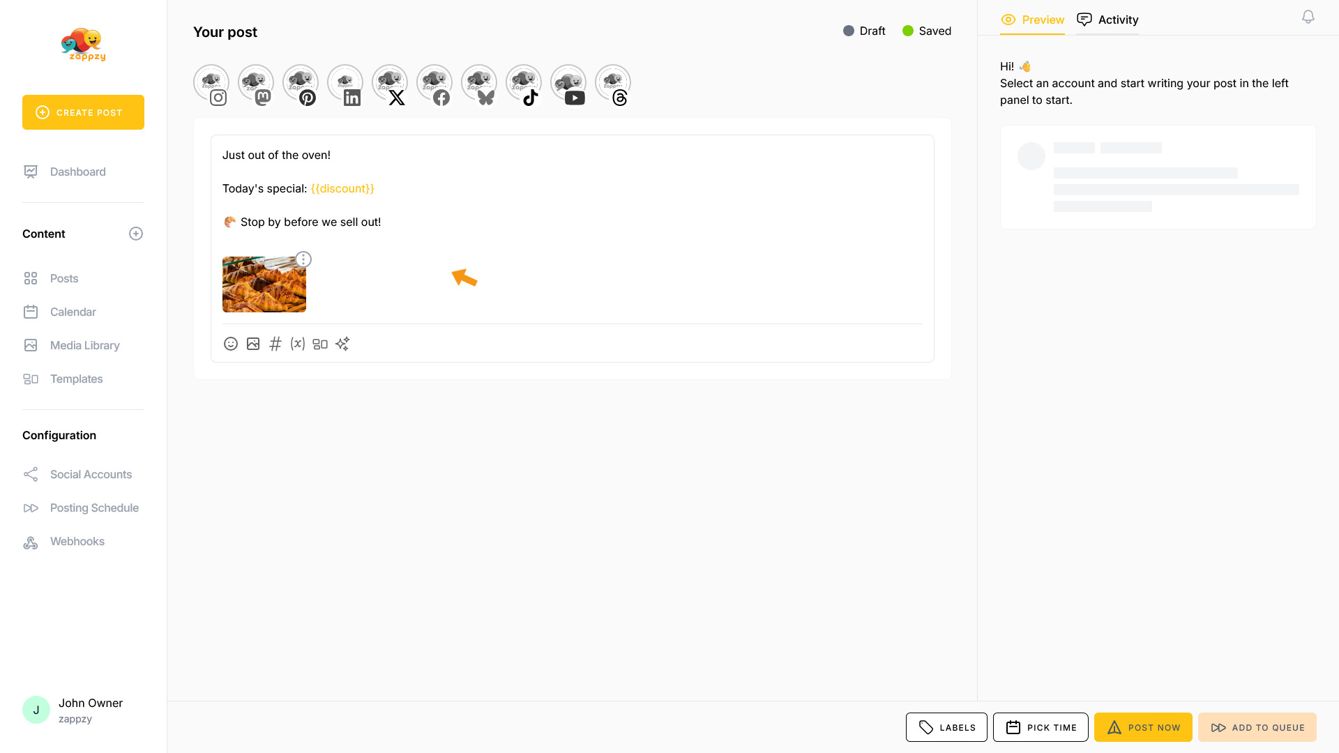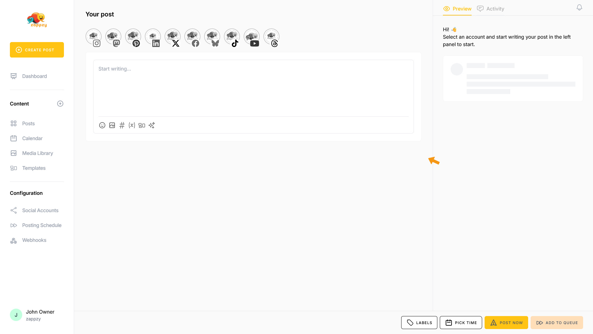 Once you're logged in to zappzy, you'll see an orange CREATE POST button in the left menu. Click on it.