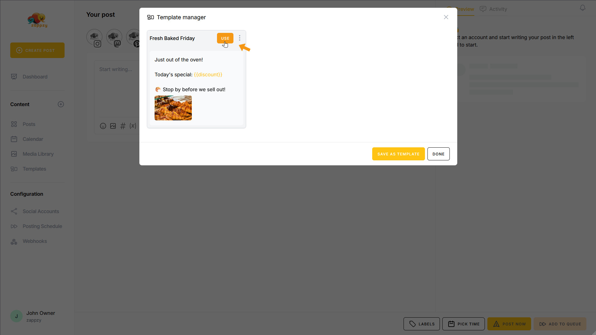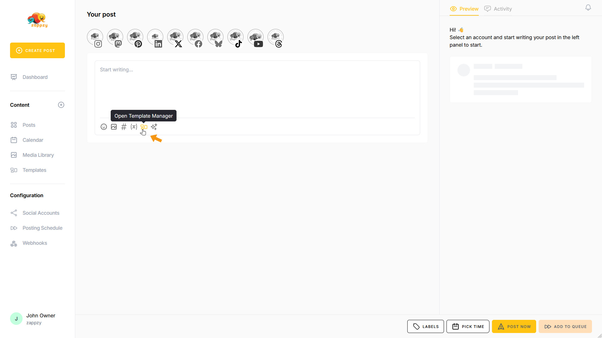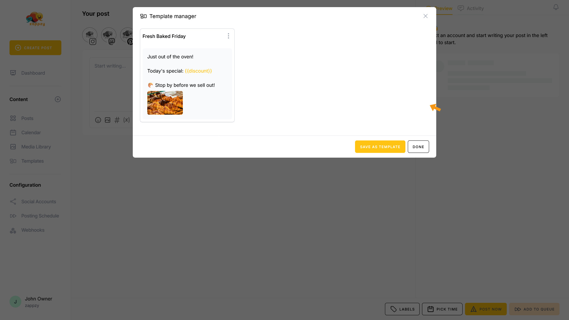 zappzy Support Center > Content > Create posts > Template Manager: Insert saved templates instantly into your posts