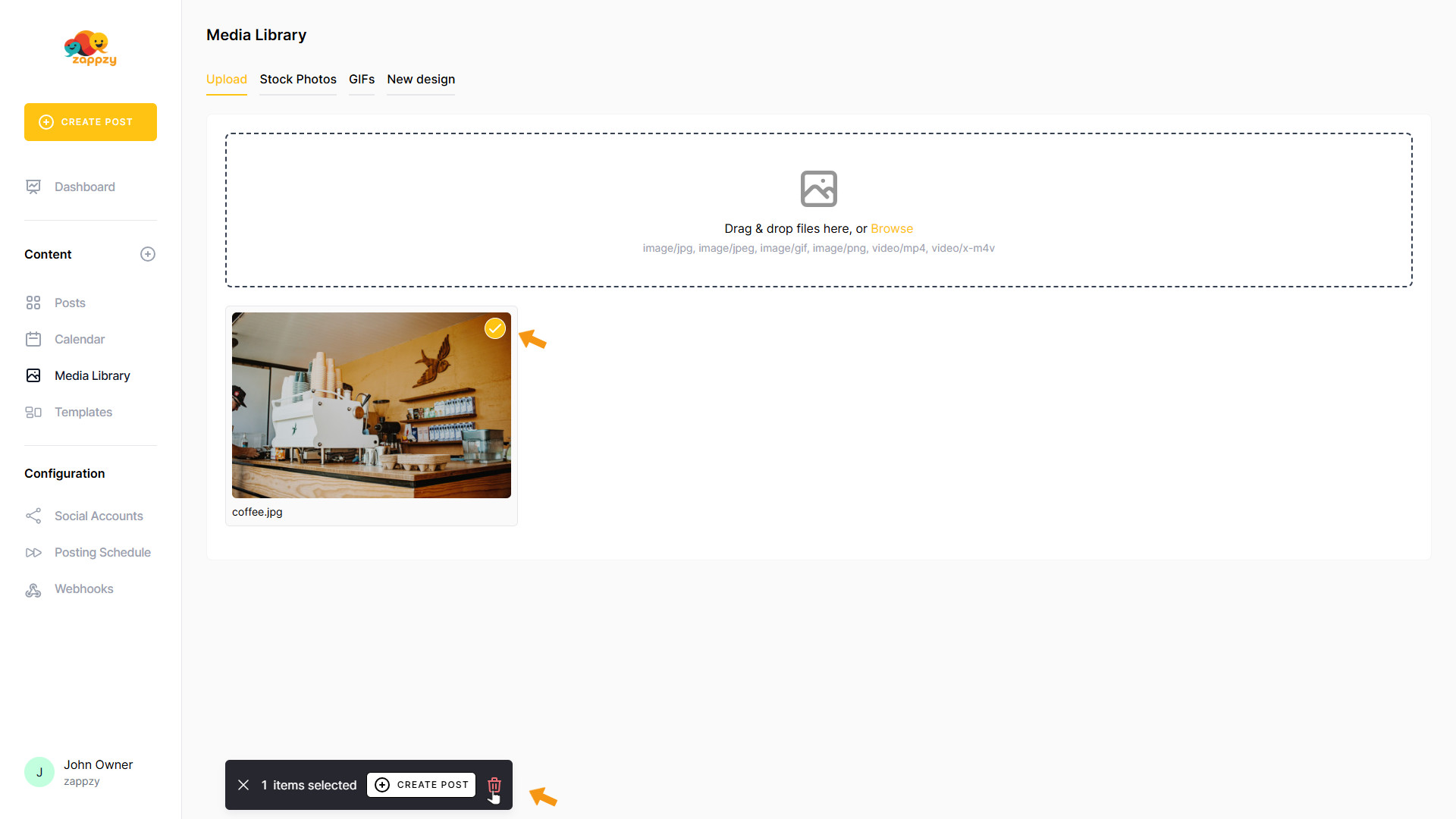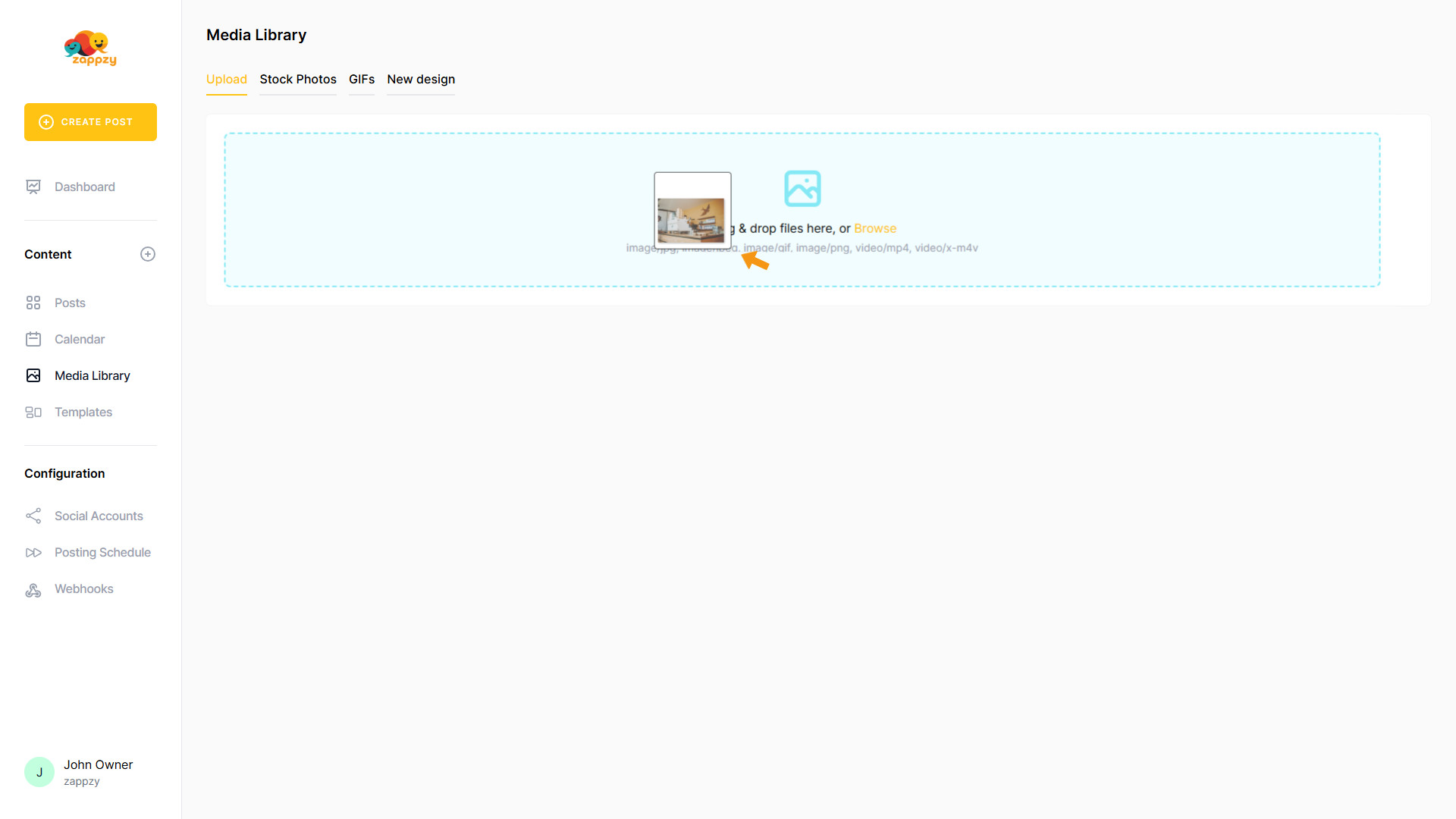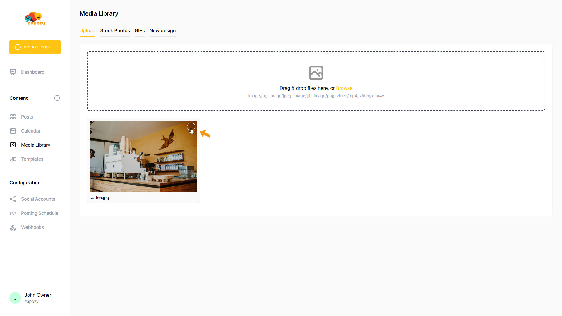 zappzy Support Center > Content > Media Library > Upload: Bring in your own images and videos—reuse them across your posts