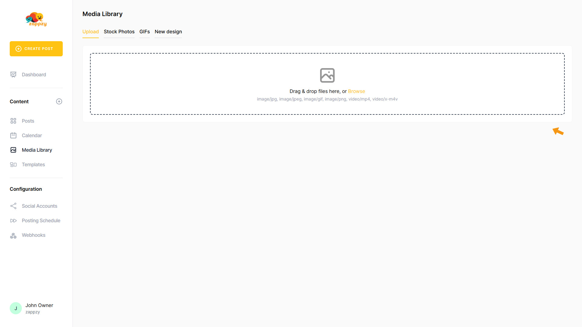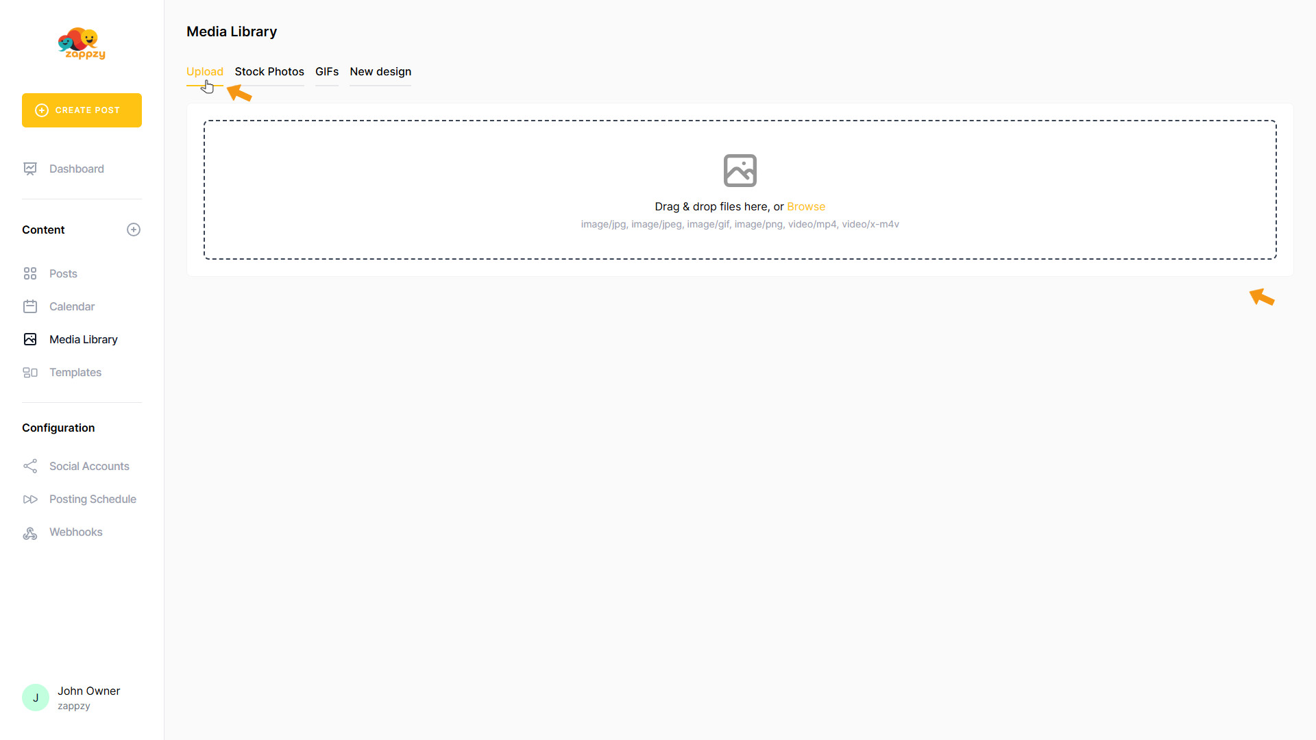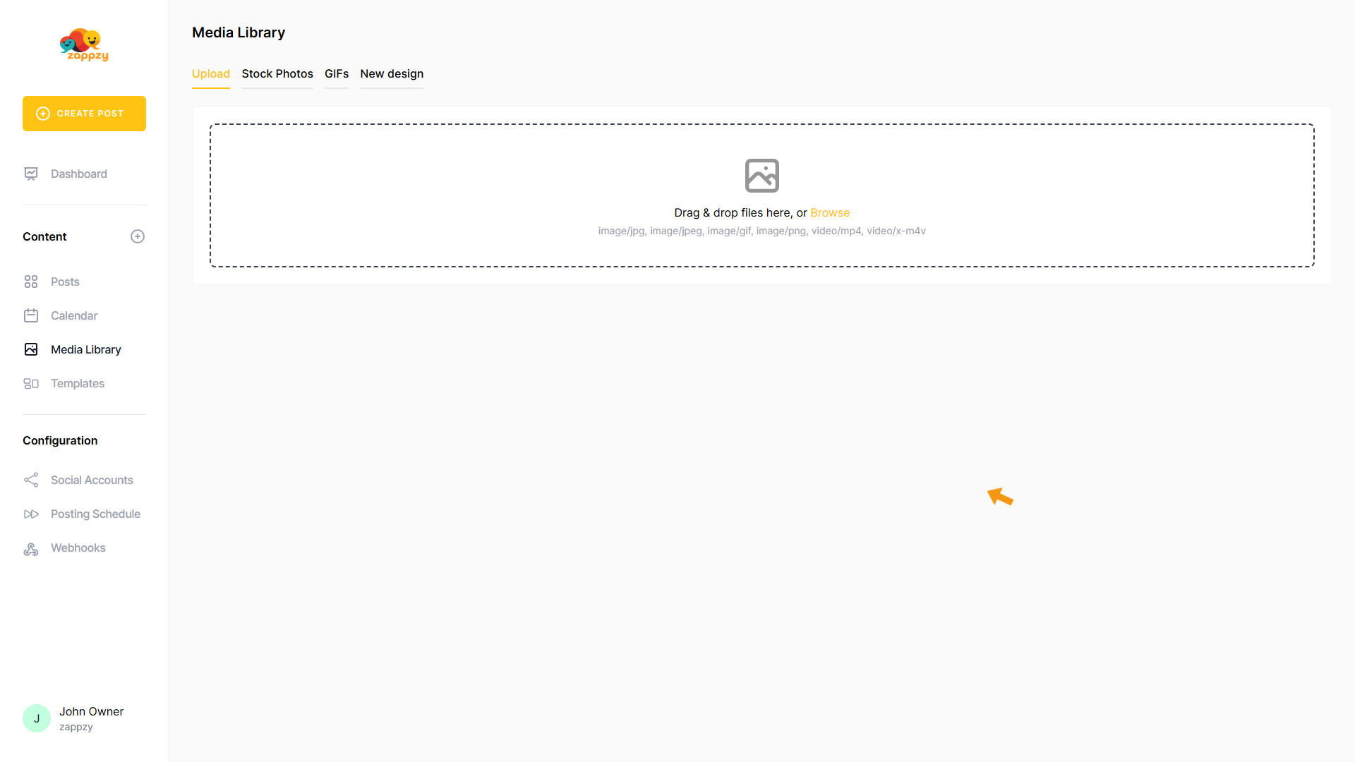 zappzy Support Center > Content > Media Library > Upload: Bring in your own images and videos—reuse them across your posts