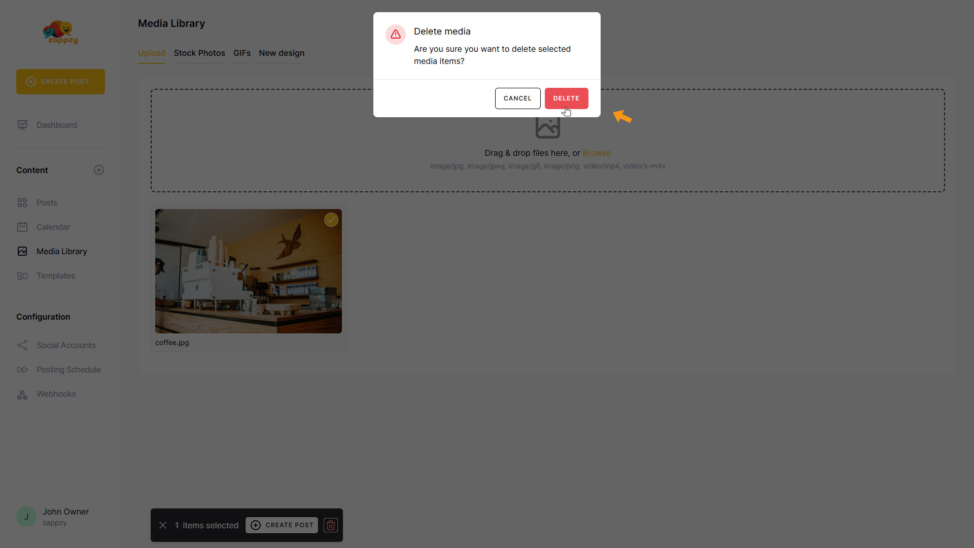 For security reasons, a confirmation pop-up appears asking if you really want to delete the media item. If you’re sure, click Delete.