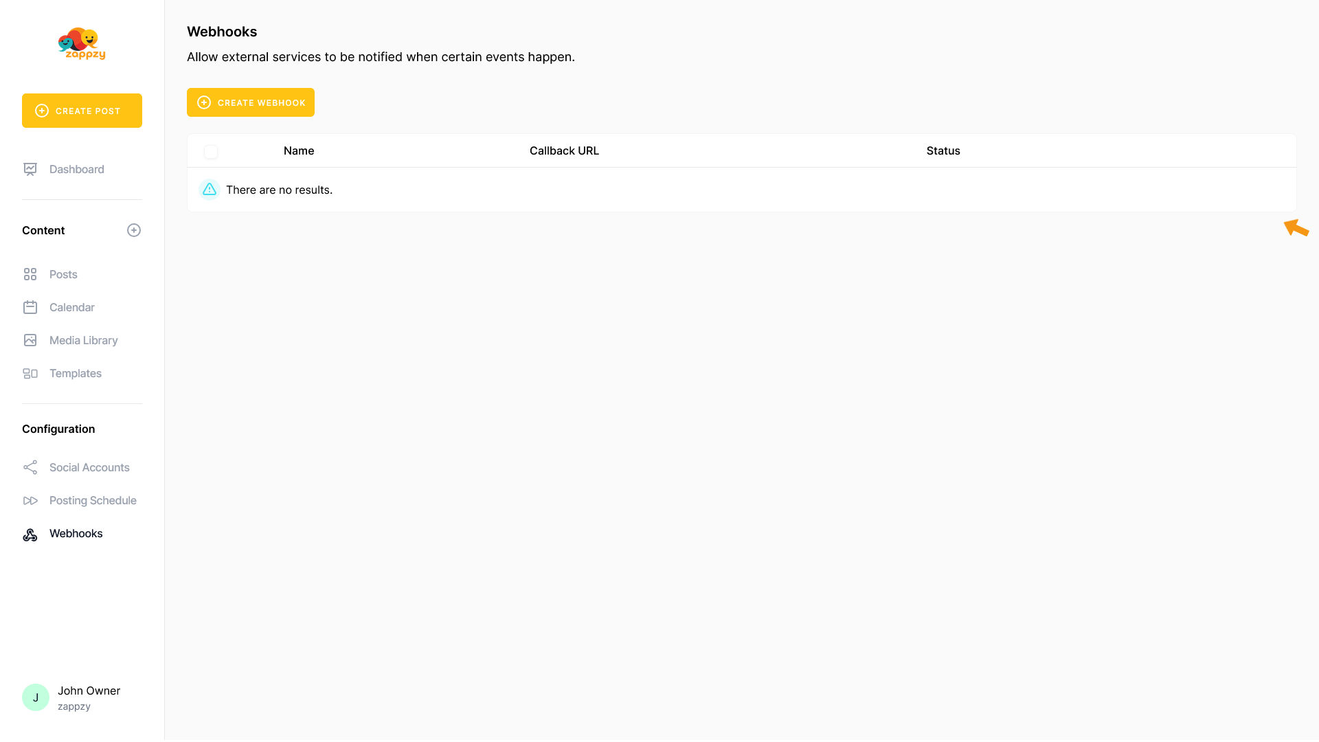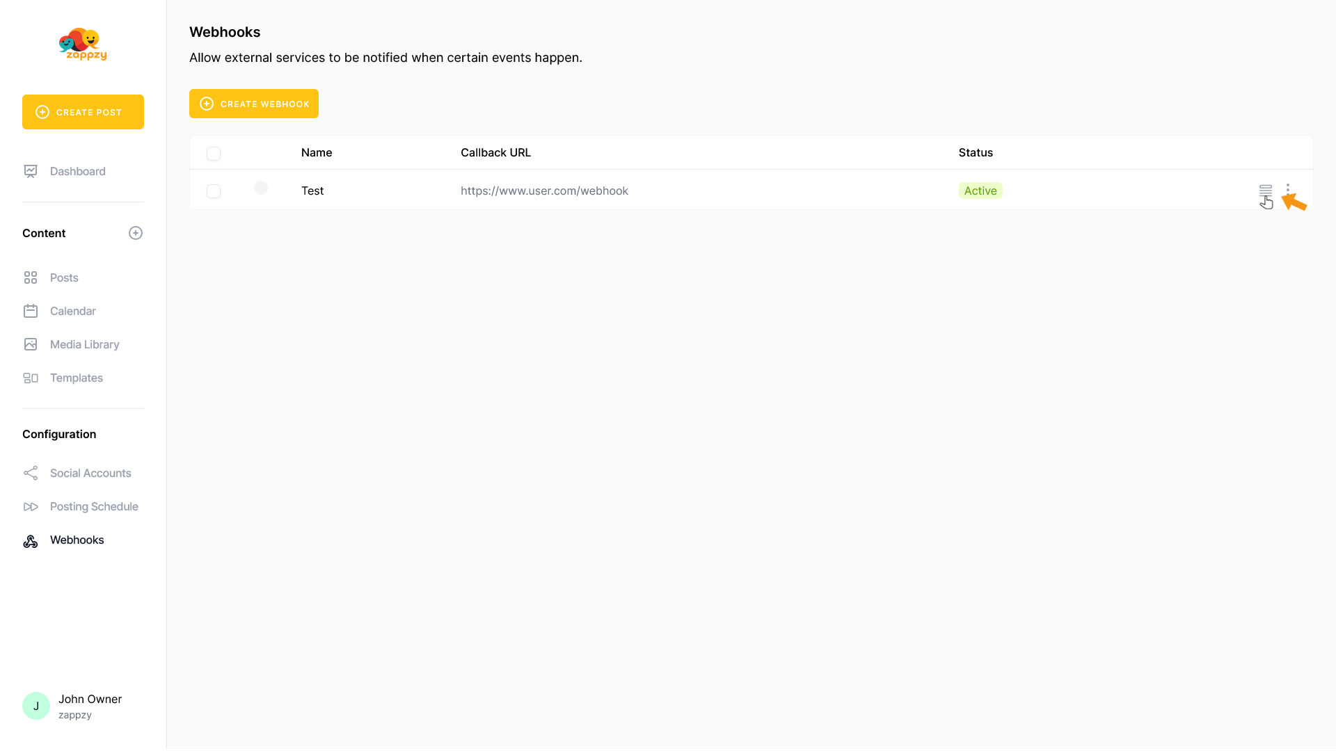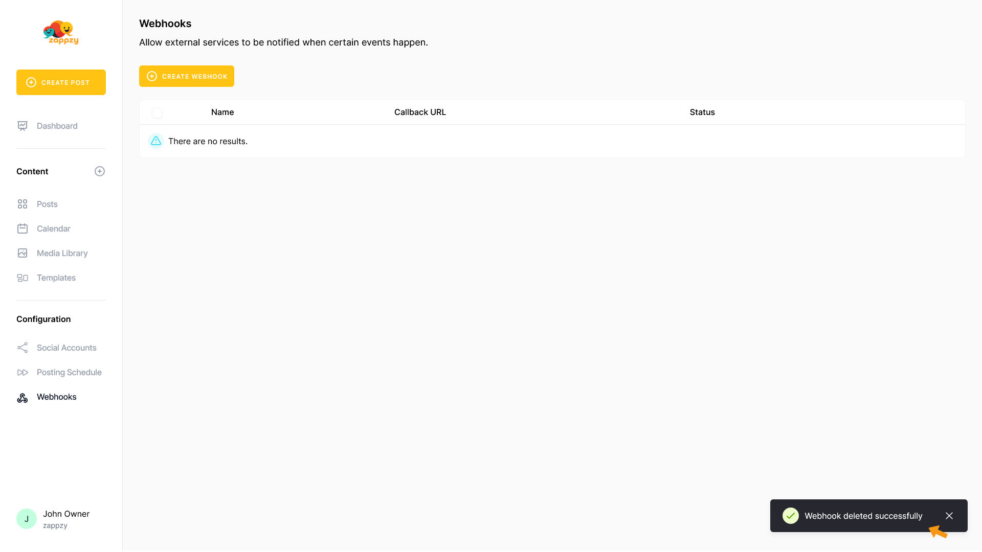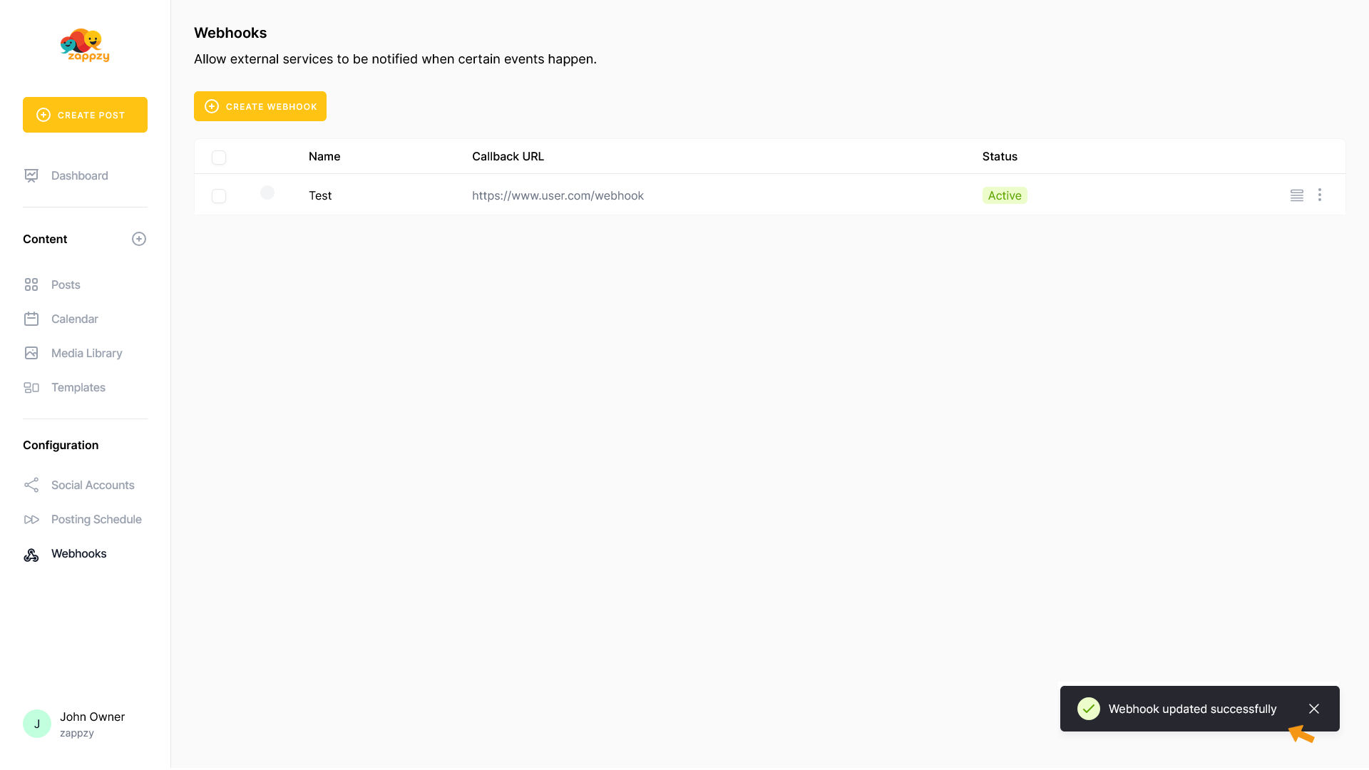 Webhooks send automatic notifications to other tools when events happen in zappzy - like notifying Slack when a post goes live or updating your CRM when you add a new social media account.