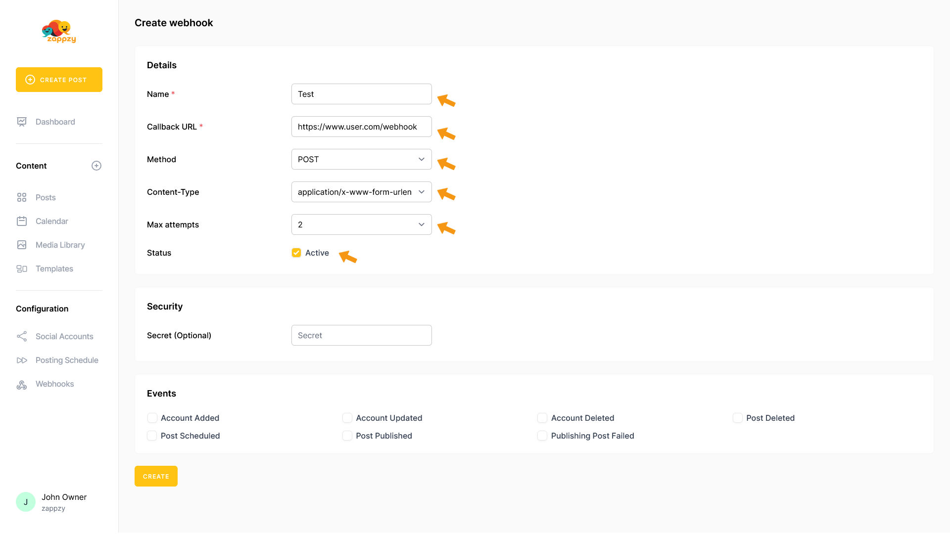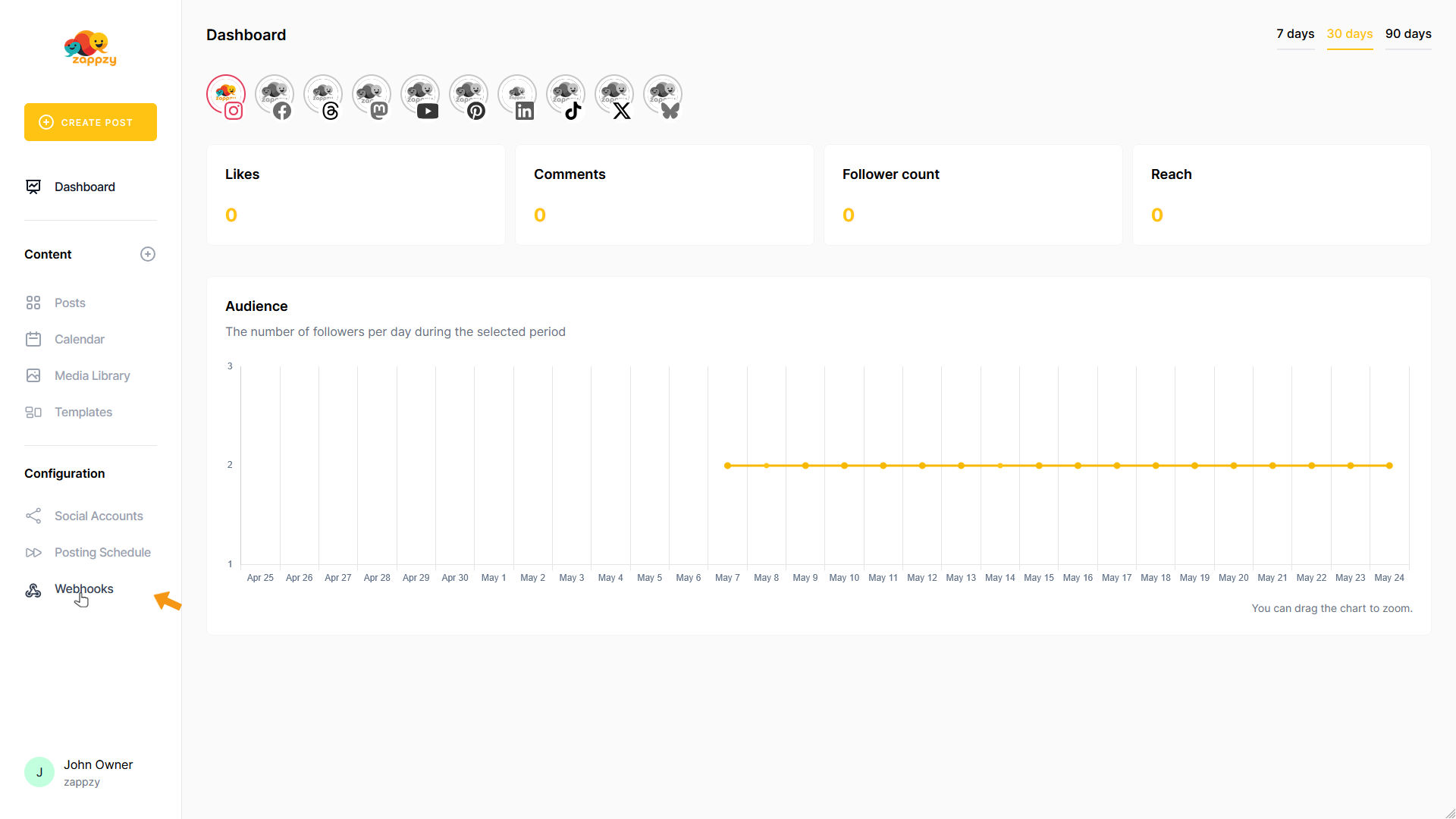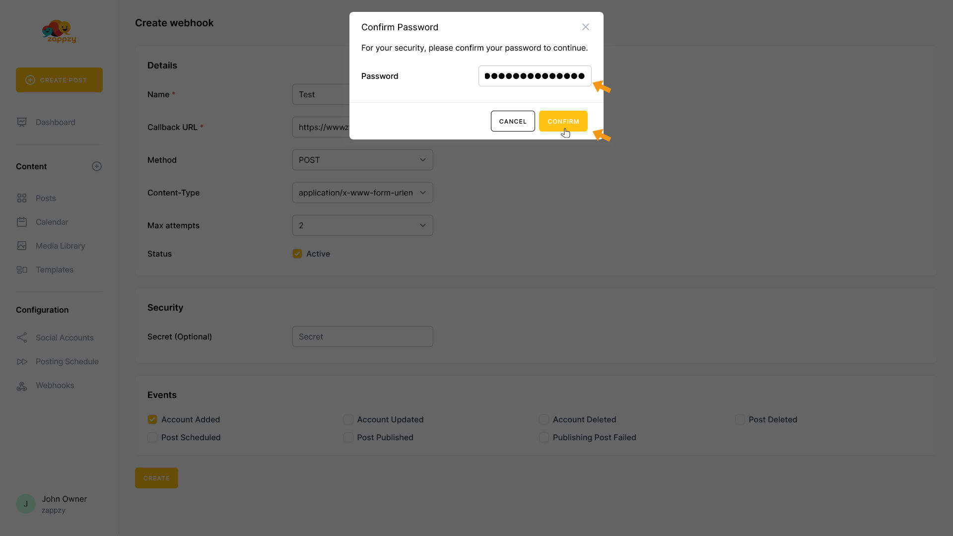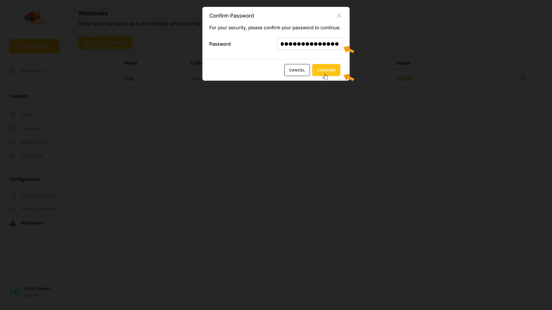 Webhooks send automatic notifications to other tools when events happen in zappzy - like notifying Slack when a post goes live or updating your CRM when you add a new social media account.