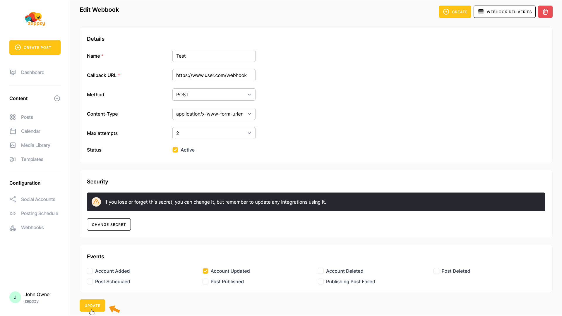The Edit Webhook form will appear on your main screen. Make your changes and click UPDATE.
