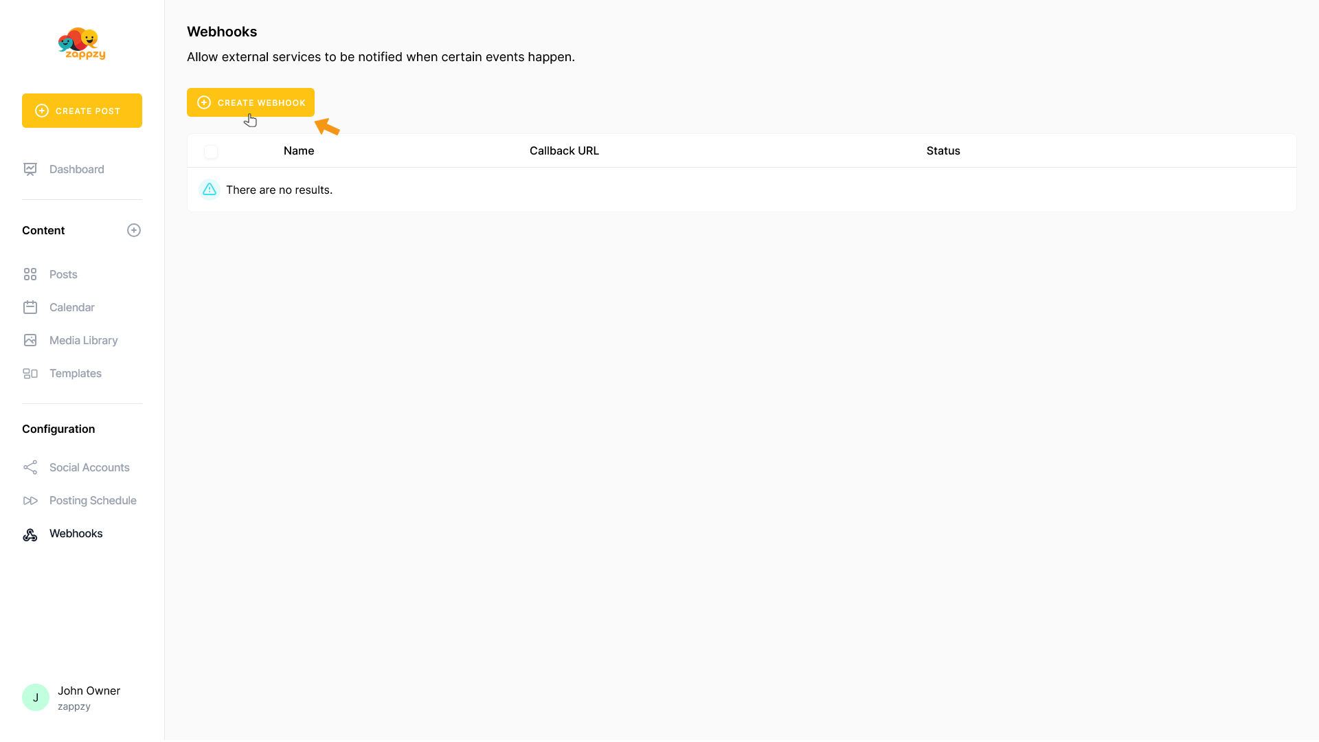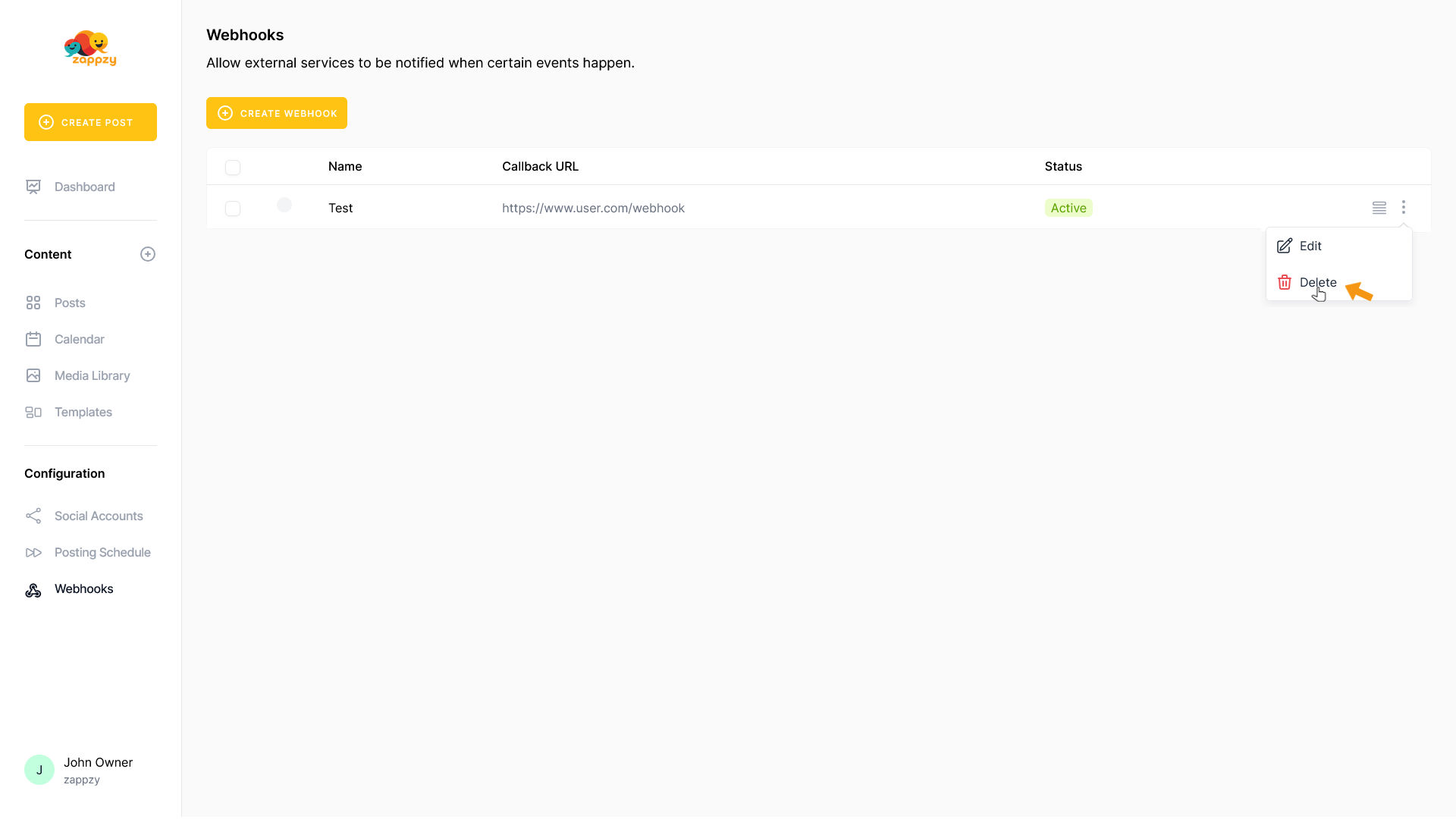 Once you're logged in to zappzy, you'll see the menu on the left side. In the Configuration section, click on Webhooks (workspace owner or admin only).
