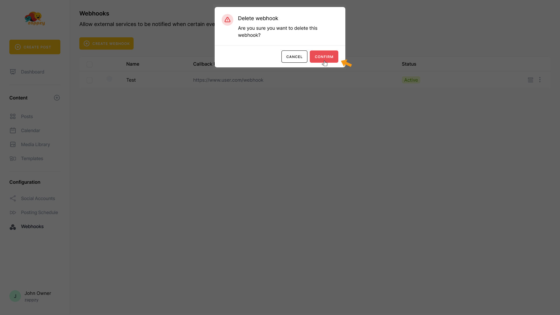 The Delete webhook pop-up appears. Click CONFIRM to delete the webhook.