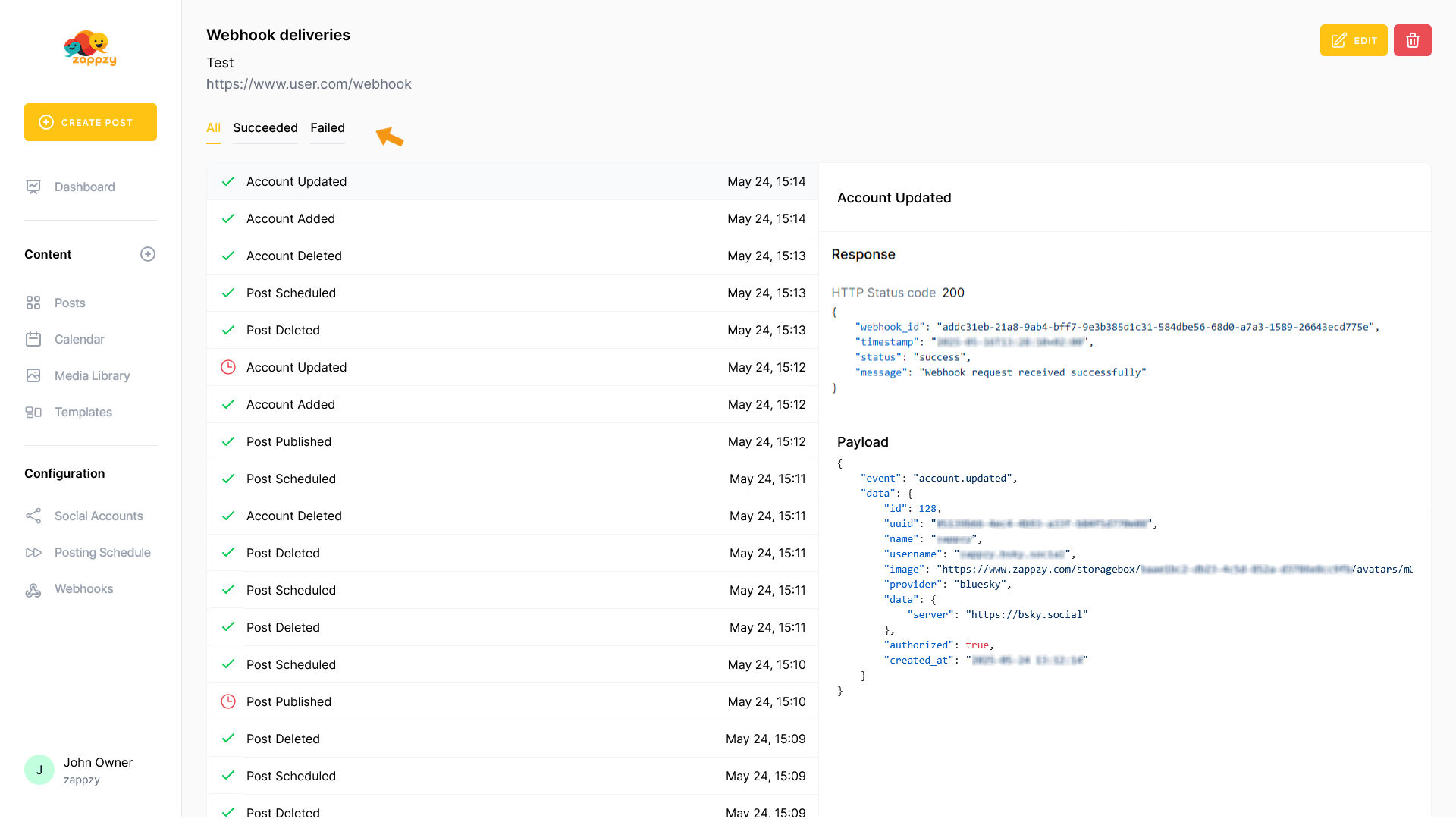 Here you can see when each event of the selected webhook succeeded or failed, along with the server response and the payload that was sent.