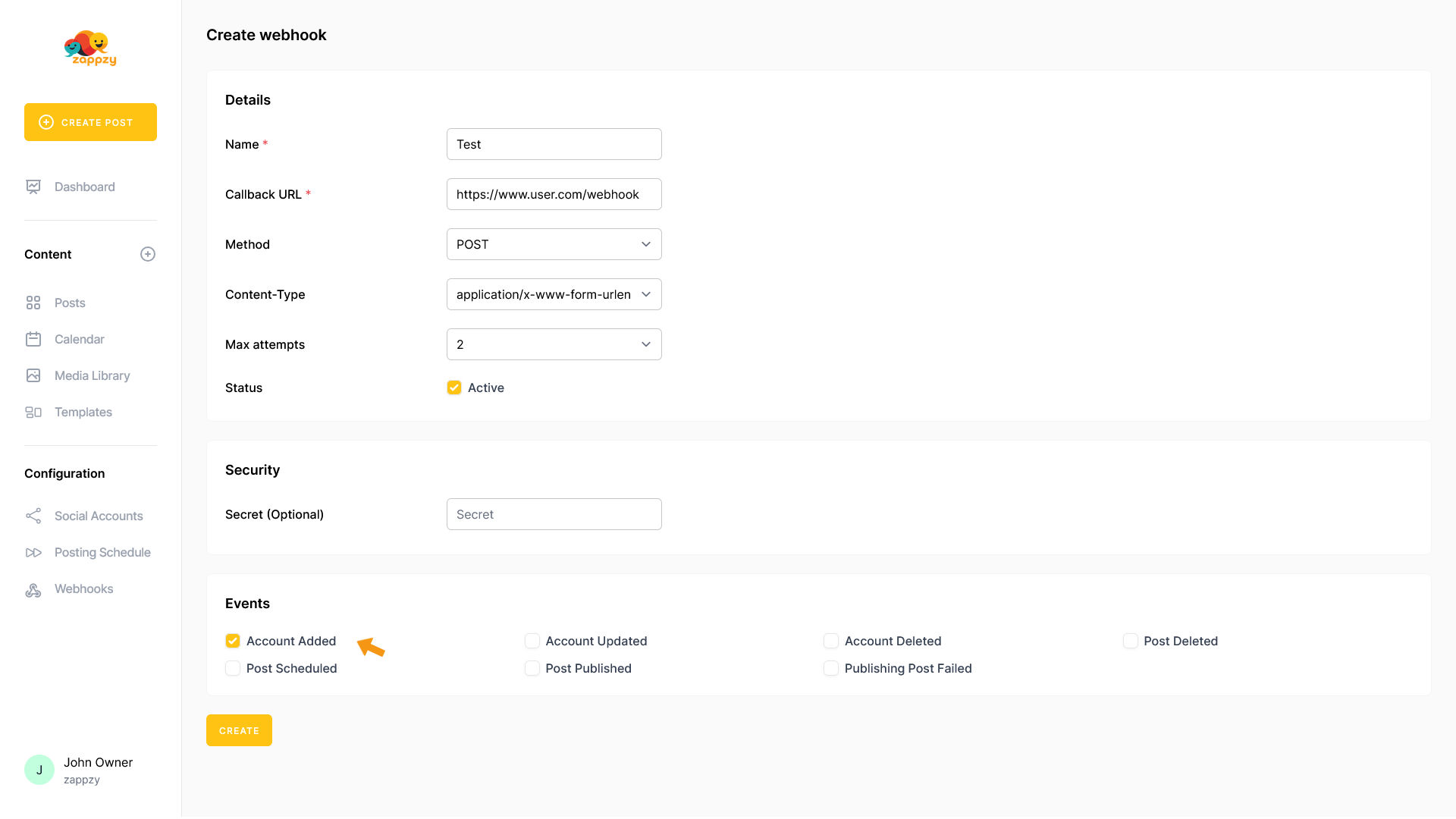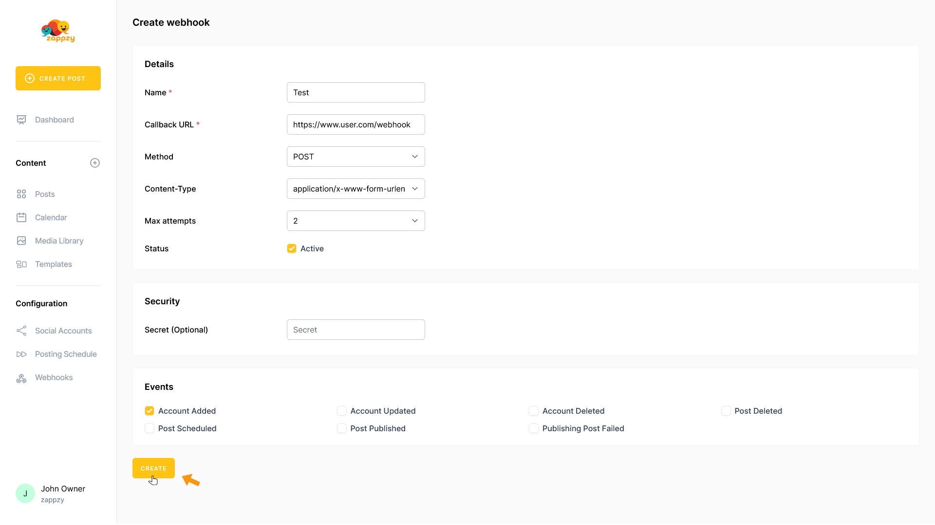 Finally, make sure Status is set to Active to enable your webhook.